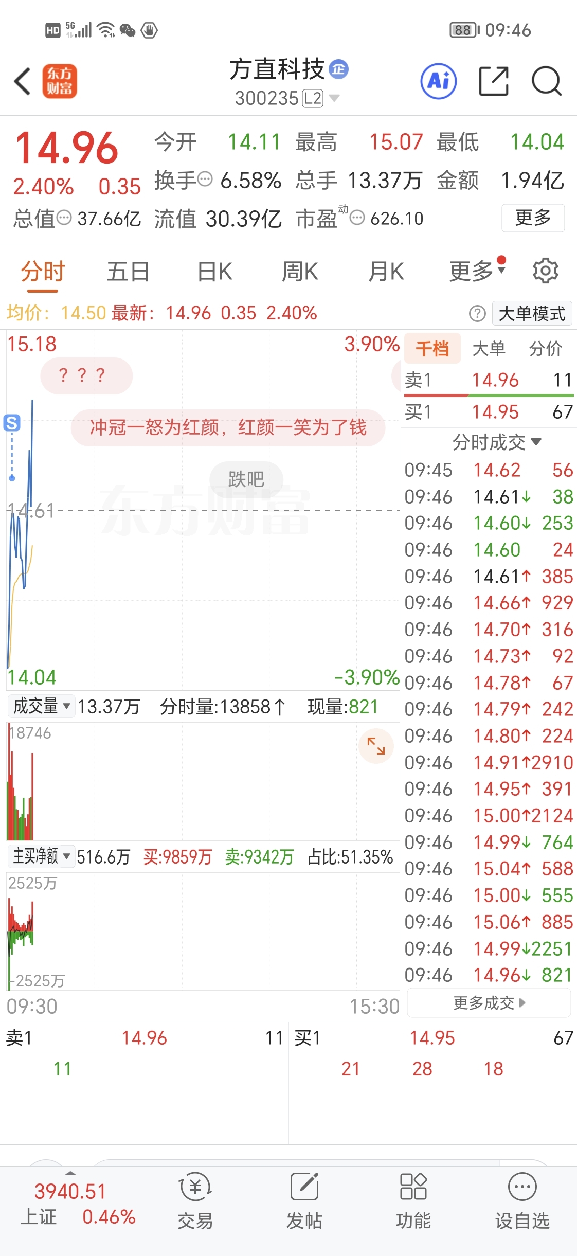 $方直科技(SZ300235)$ 昨天方直尾盘吸筹很明显,昨天想今天不要着急卖,但是今天啊他负3.5开盘,一跌又有点担心再亏钱,就趁他红的时候感觉卖了,没想到现在又涨3个点。挣4个点卖了就这样吧