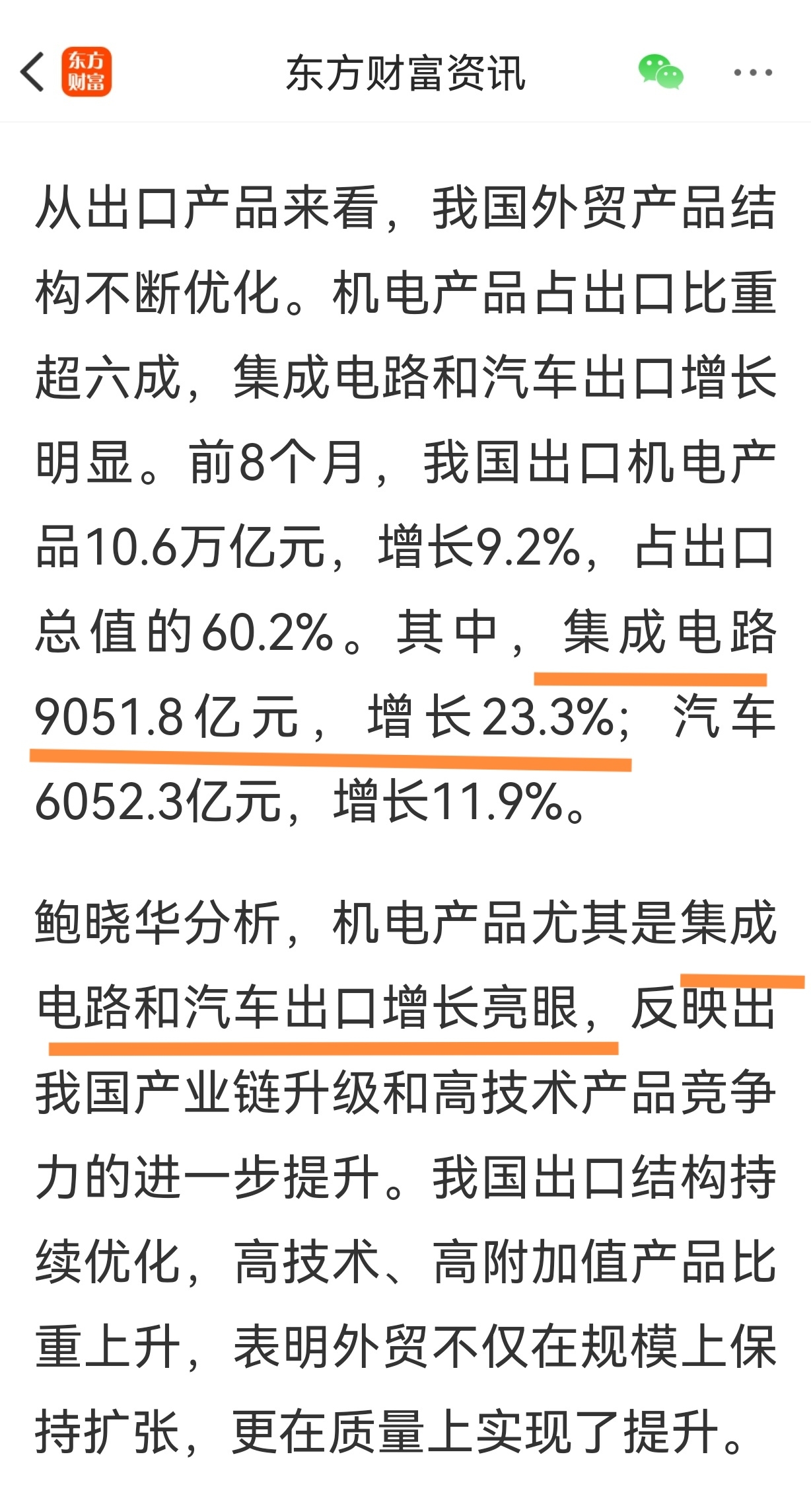 前8个月,我国出口机电产品10.6万亿元,增长9.2%,占出口总值的60.2%。其中,集成电路9051.8亿元,增长23.3%;汽车6052.3亿元,增长11.9%。