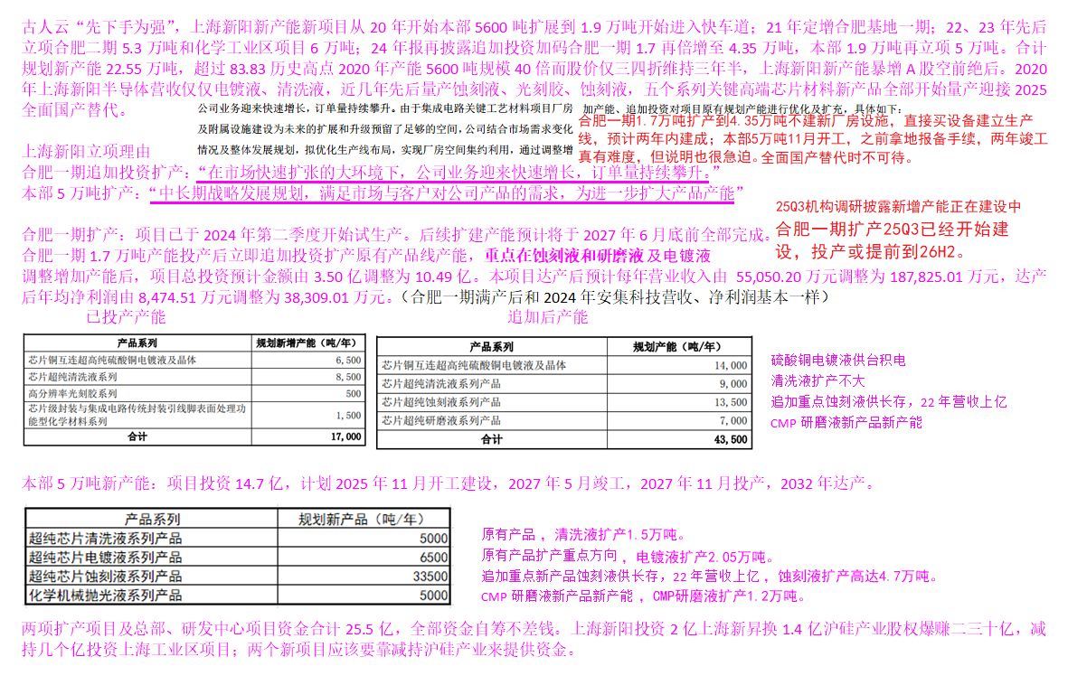 上海新阳新产能相当牛逼,24年十倍新产能井喷陆续建成投产,从合肥一期翻番产能去年四季度投产已经开始,接下来合肥一期扩产利用一期建成厂房和设施开始继续建设也就是买设备和调试,说不定明年上半年就可以开始试产,合肥二期、上海化学工业区项目和本部扩产两年内陆续建成就阔以了。