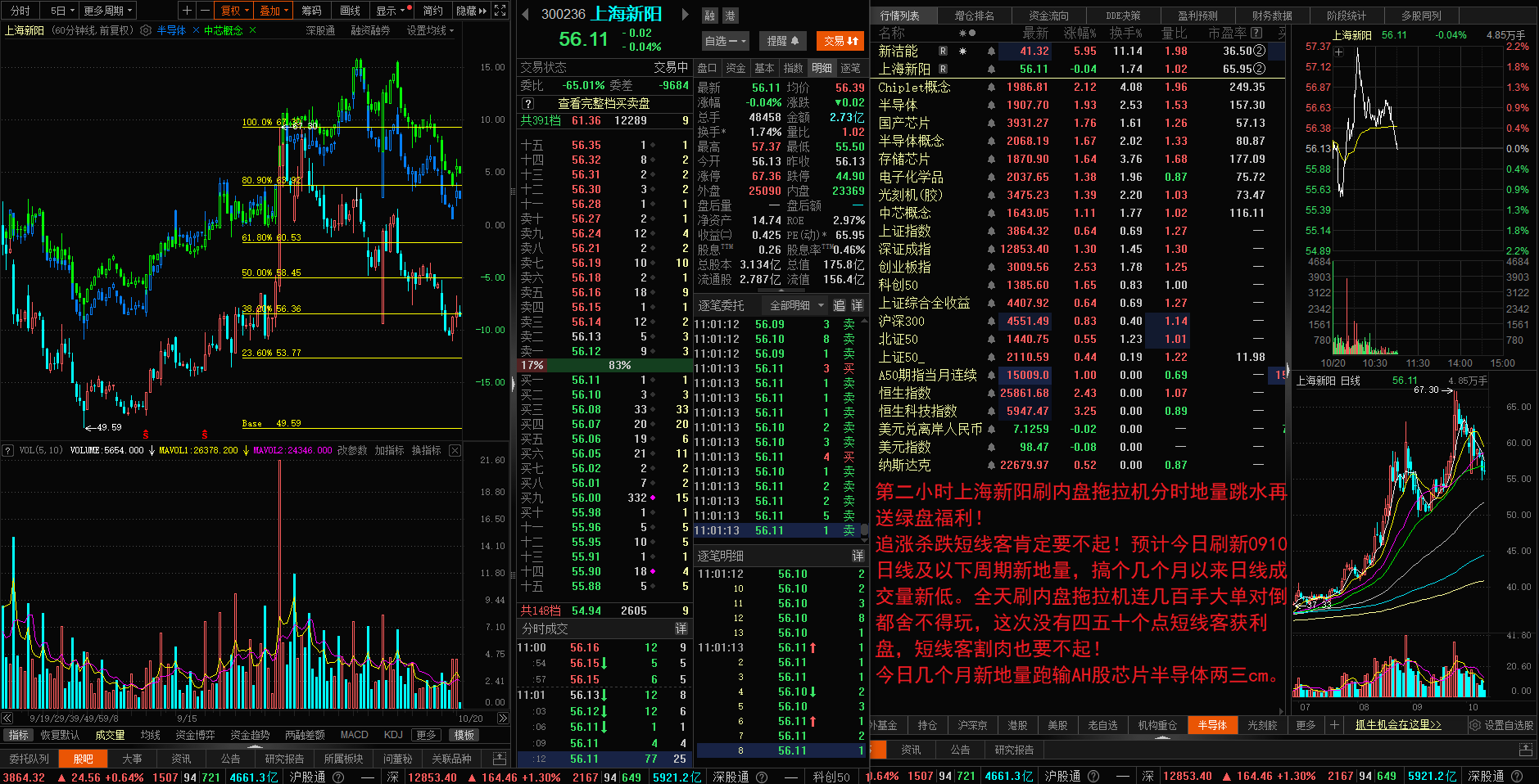 追涨杀跌短线客肯定要不起!预计今日刷新0910日线及以下周期新地量,搞个几个月以来日线成交量新低。全天刷内盘拖拉机连几百手大单对倒都舍不得玩,这次没有四五十个点短线客获利盘,短线客割肉也要不起!今日几个月新地量跑输AH股芯片半导体两三cm。