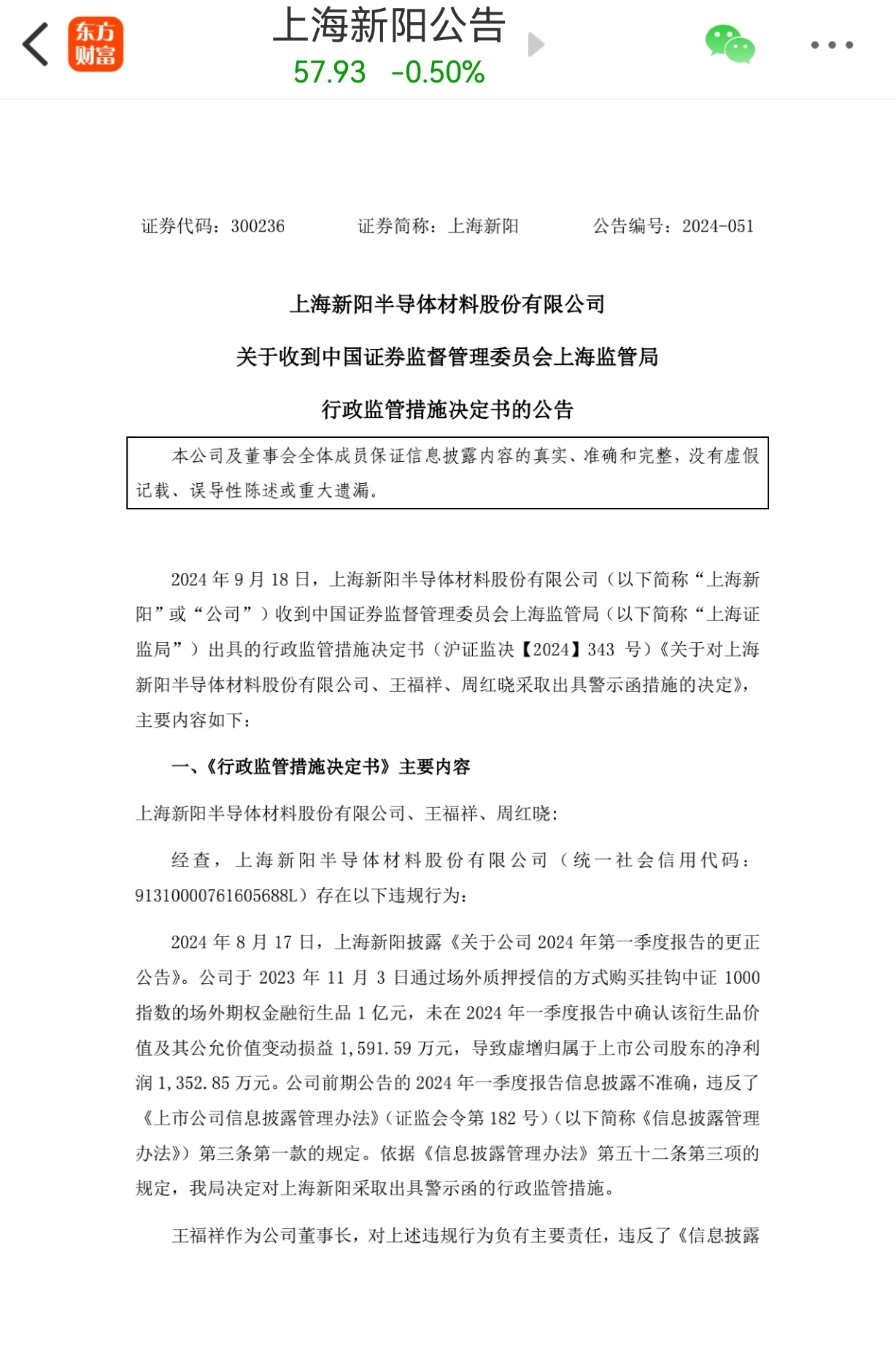 不差钱的上海新阳一亿搞场外期权衍生品,24一季报财报疏漏没有把亏损算进一季报,半年报虽然纠正了错误,结果收到监管函,0918直接二级市场股价独立破位长阴,最后0924还是跟随A股超级反弹,看公告割肉的傻散拍断腿