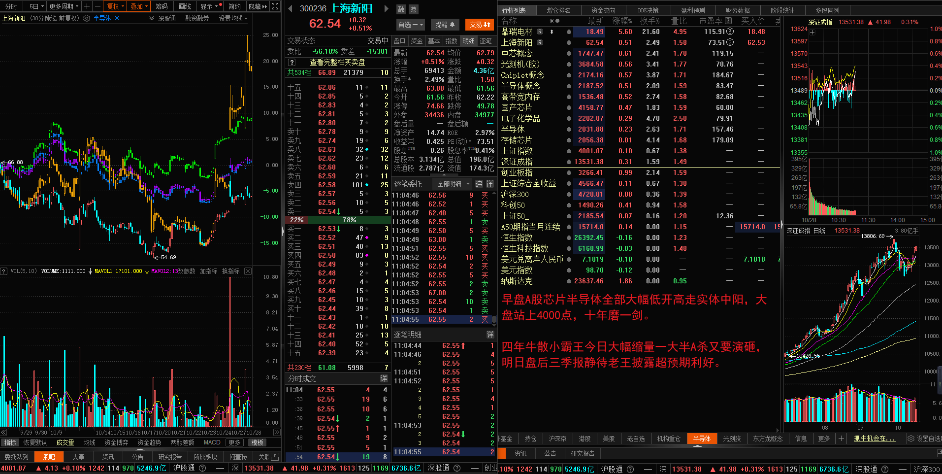 早盘A股芯片半导体全部大幅低开高走实体中阳,大盘站上4000点,十年磨一剑。四年