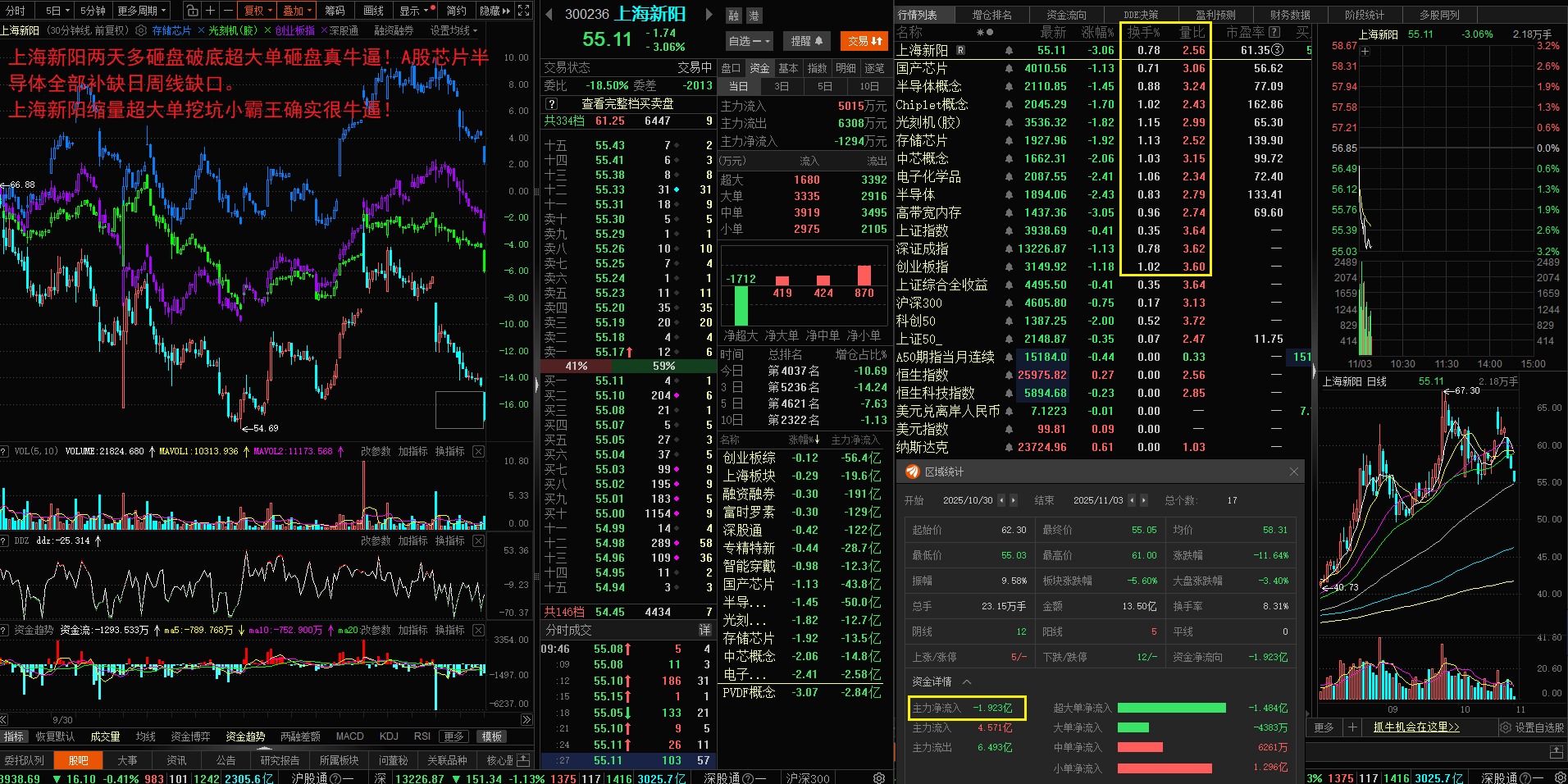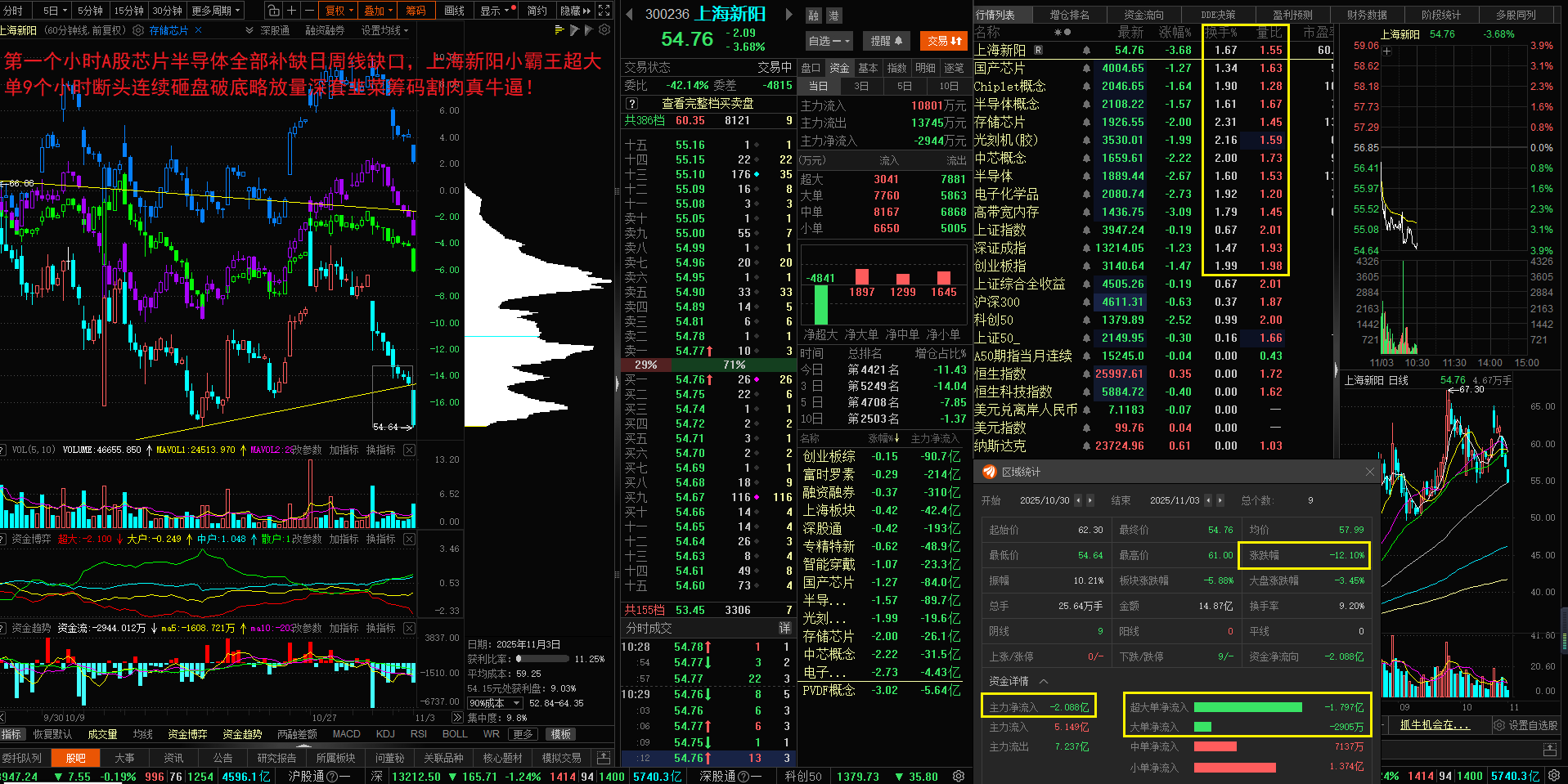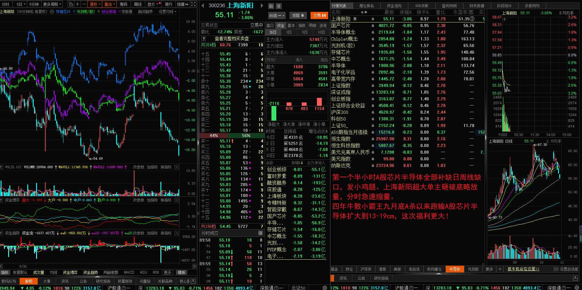 第一个小时A股芯片半导体全部补缺日周线缺口,上海新阳小霸王超大单9个小时断头连续砸盘破底略放量深套韭菜筹码割肉真牛逼!