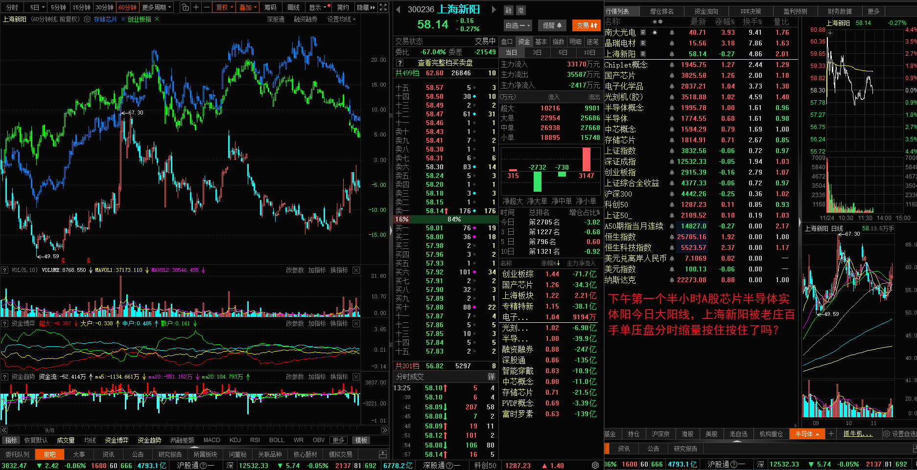 下午第一个半小时A股芯片半导体实体阳今日大阳线,上海新阳被老庄百手单压盘分时缩量