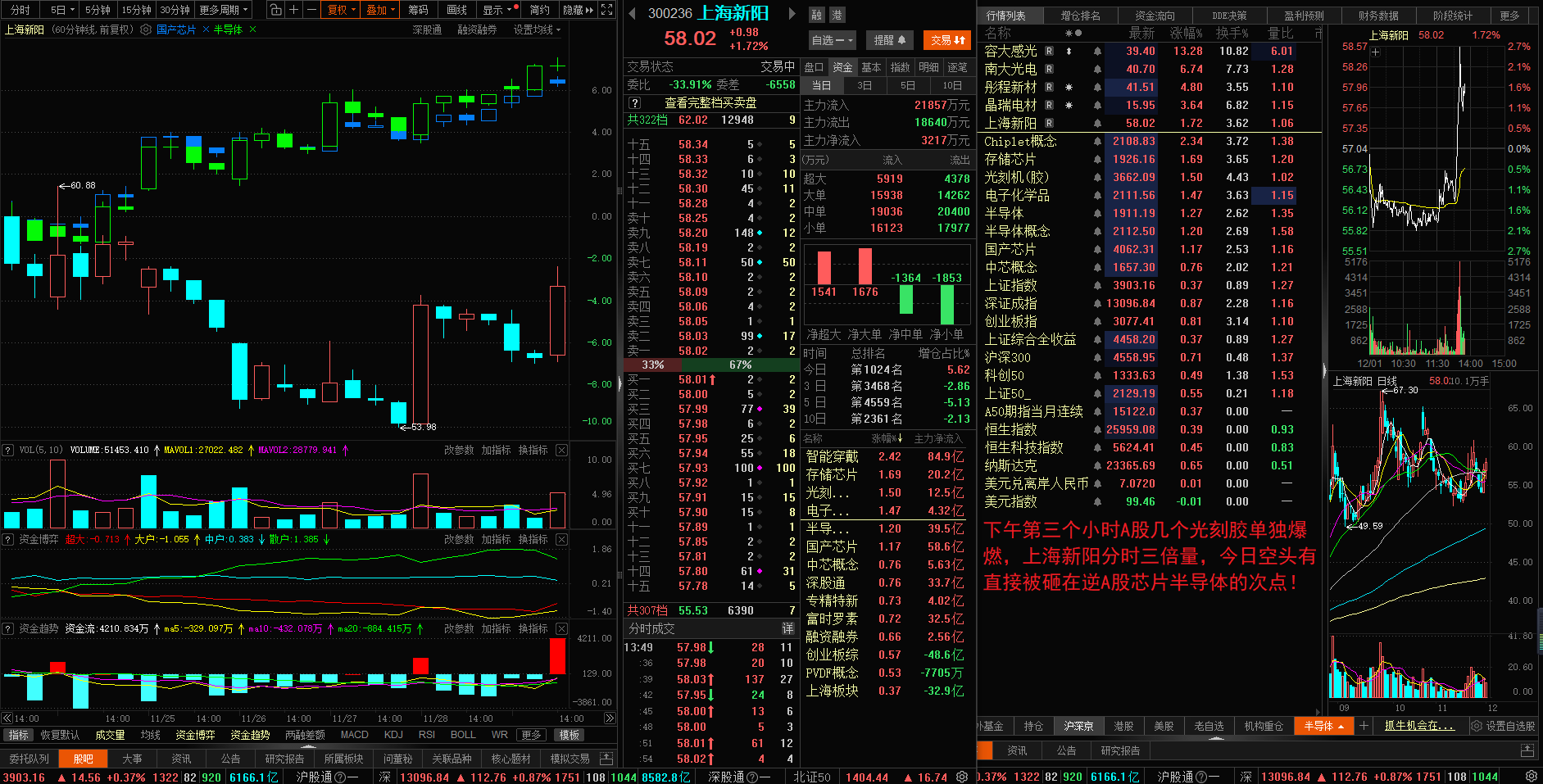 下午第三个小时A股几个光刻胶单独爆燃,上海新阳分时三倍量,今日空头有直接被砸在逆