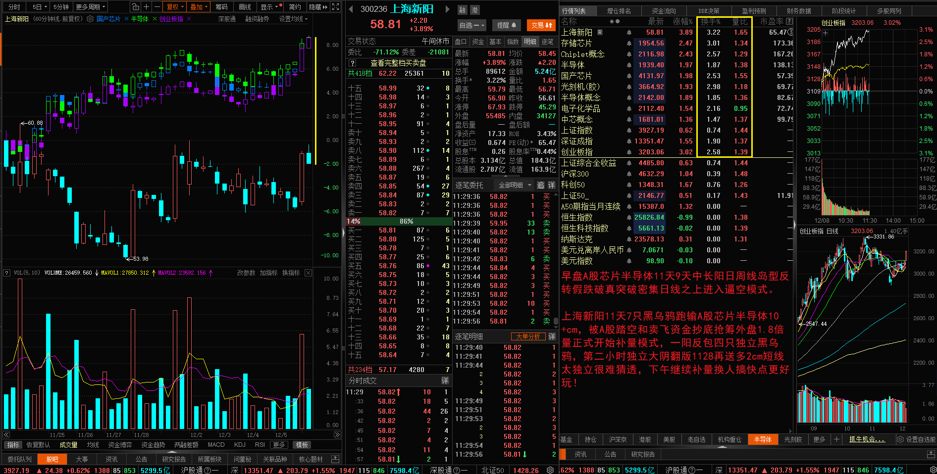 上海新阳11天7只黑乌鸦跑输A股芯片半导体10+cm,被A股踏空和卖飞资金抄底抢筹外盘1.8倍量正式开始补量模式,一阳反包四只独立黑乌鸦,第二小时独立大阴翻版1128再送多2cm短线太独立很难猜透,下午继续补量换人搞快点更好玩!