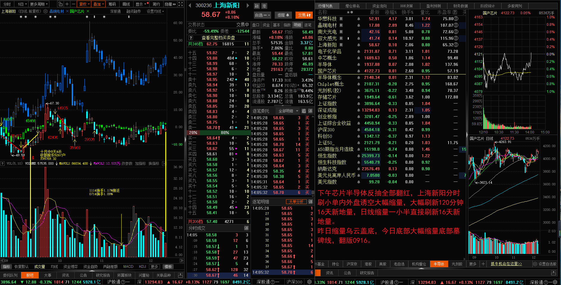 下午芯片半导体反抽全部翻红,上海新阳分时刷小单内外盘诱空大幅缩量,大幅刷新120