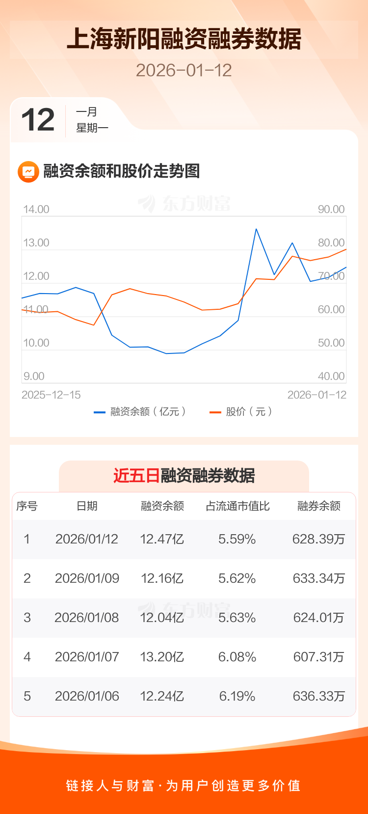 交易所最新数据显示,上海新阳于2026年1月12日获融资买入2.79亿元,融资偿还2.48亿元,当日融资净买入3122.82万元。目前,该股融资余额12.47亿,占流通市值比例为5.59%。