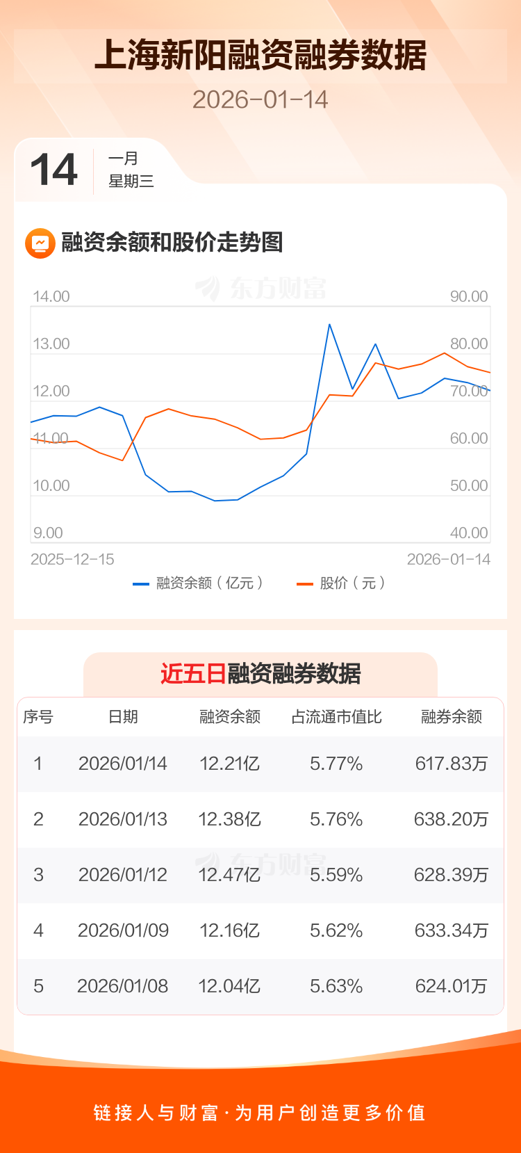 交易所最新数据显示,上海新阳于2026年1月14日获融资买入1.86亿元,融资偿还2.03亿元,当日融资净偿还1710.96万元。目前,该股融资余额12.21亿,占流通市值比例为5.77%。