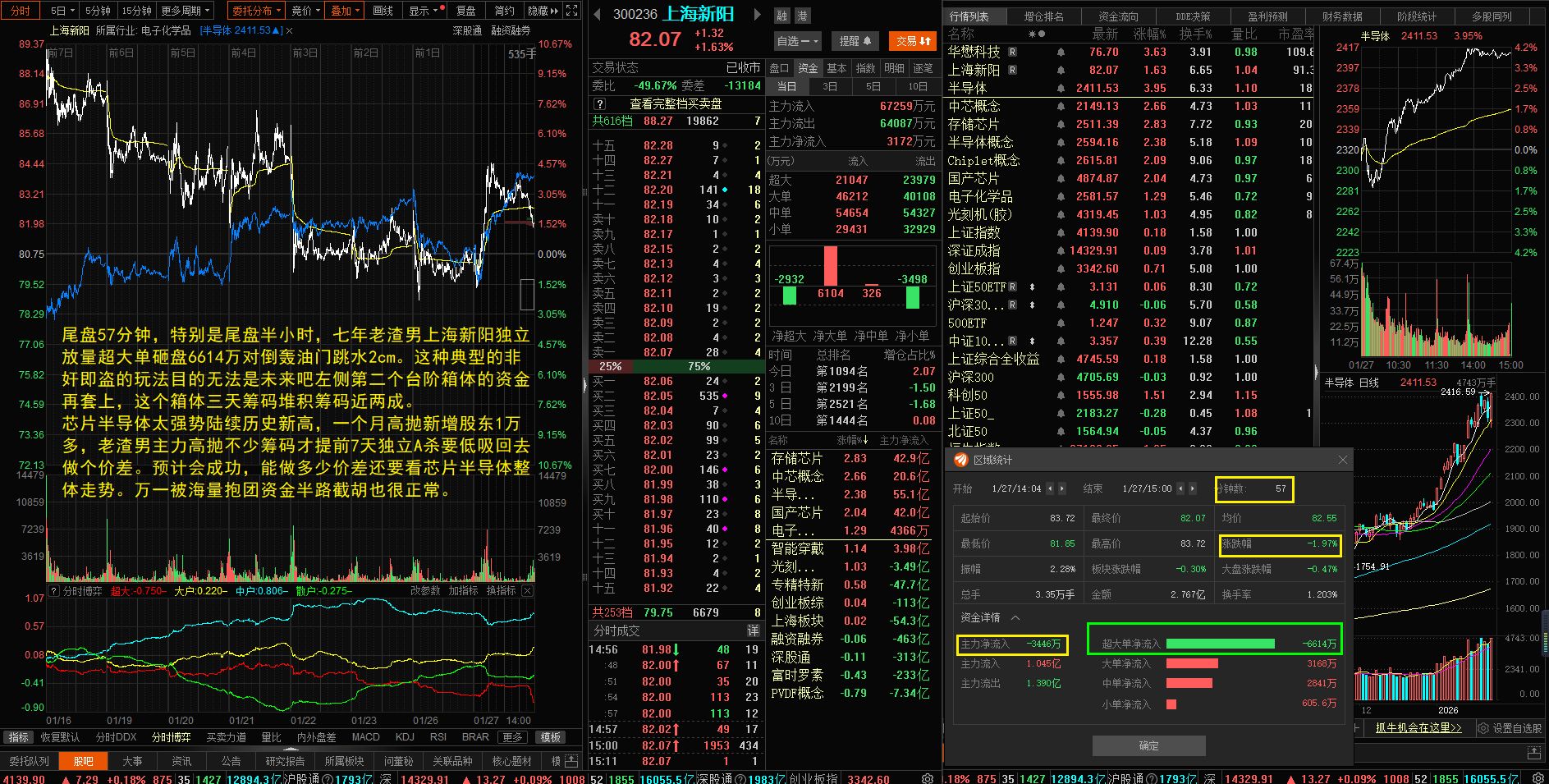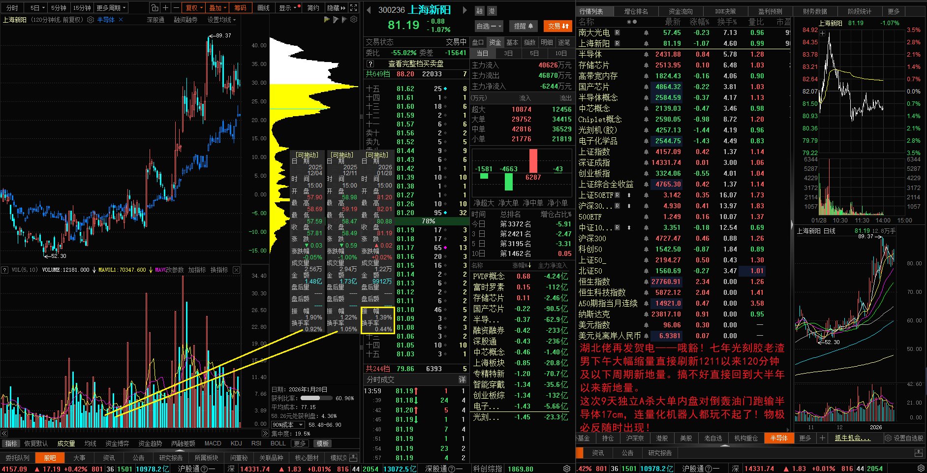 短线客收割光了吗?反向芯片半导体独立反杀跑输15cm,老渣男大单内盘对倒轰油门诱空也都吓不着被套筹码割肉了吗?