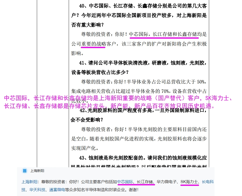 上海新阳头部存储芯片客户海力士、长江存储、长鑫存储、台积电、中芯国际、华虹公司等关键材料供应商。