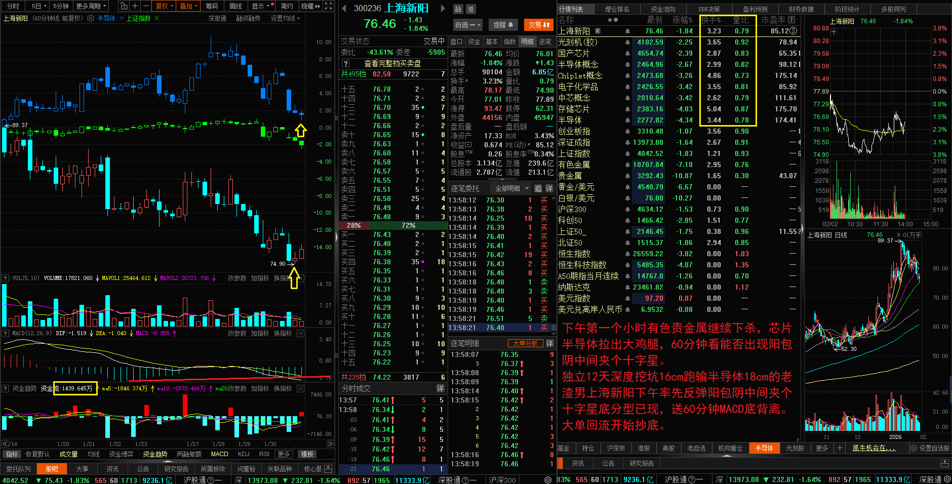 独立12天深度挖坑16cm跑输半导体18cm的老渣男上海新阳下午率先反弹阳包阴中间夹个十字星底分型已现,送60分钟MACD底背离。大单回流开始抄底。