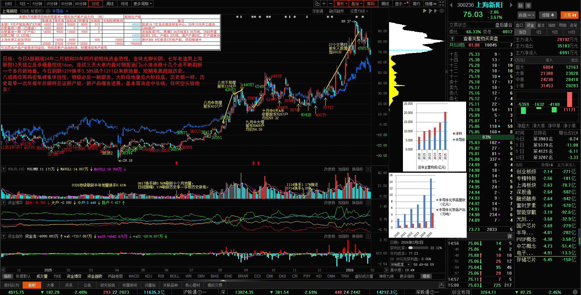 独立12天深度挖坑16cm跑输半导体18cm的老渣男上海新阳大单内盘对倒轰油门3天大单砸盘3.7亿连续三天刷新1219以来新地量。八成高位密集筹码峰全部上挂,预计明日A股跌幅减少刷新1211以来两个月新地量。