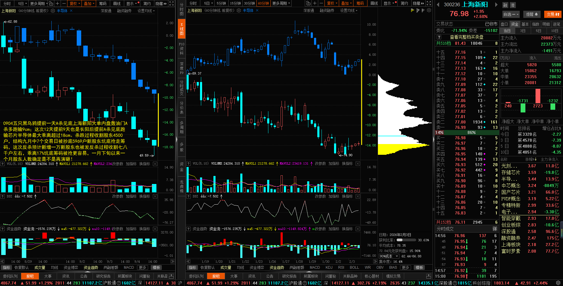 0904五只黑乌鸦提前一天A杀见底上海新阳大单内盘轰油门A杀多跑输9cm;这次12天提前9天也是长阳后提前A杀见底跑输芯片半导体最大乖离超过18cm。杀跌过程收割股东4500户,结构九月中7个交易日被抄底5969户新股东坑底抢走筹码,这次反杀预计新增一万新股东也被发反杀过程收割七八千户左右,乖离17%坑底筹码被抢更容易,一月下旬以来一个月股东人数确定是不是再演砸!