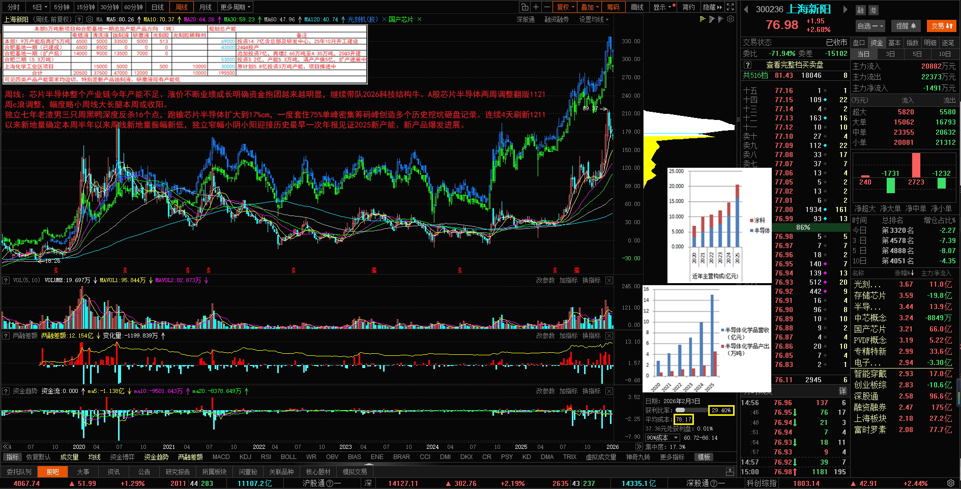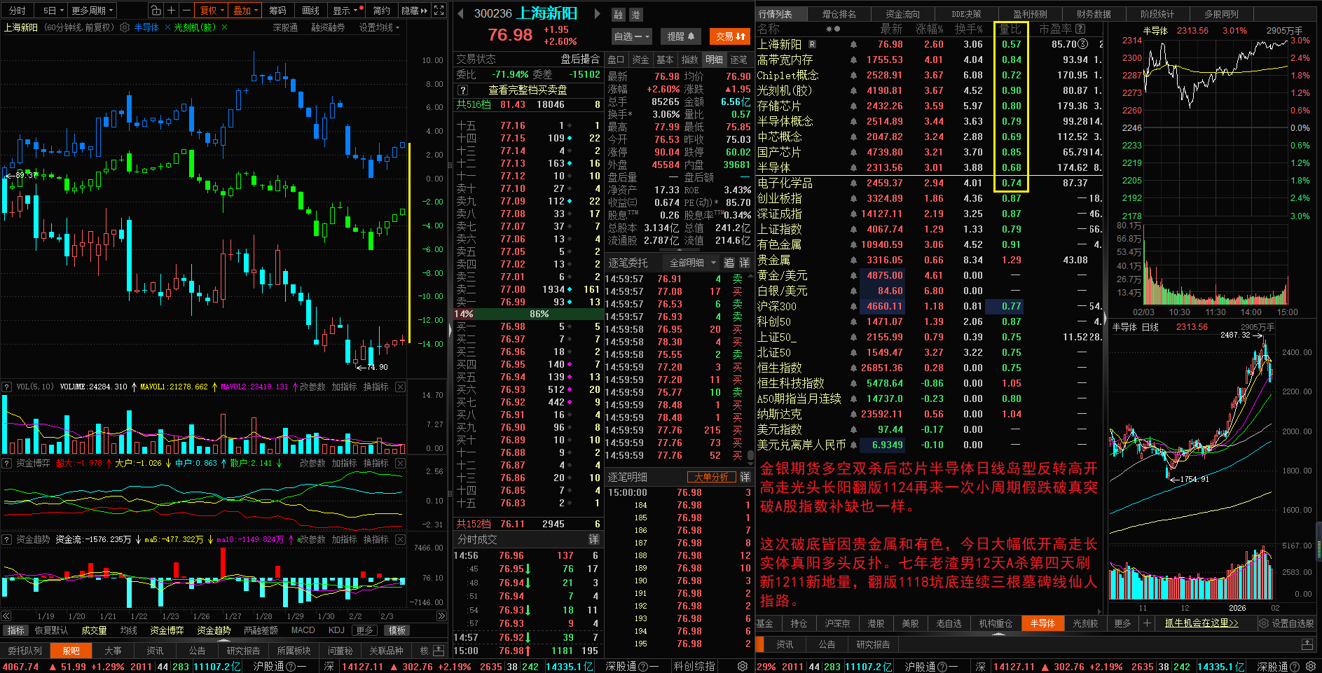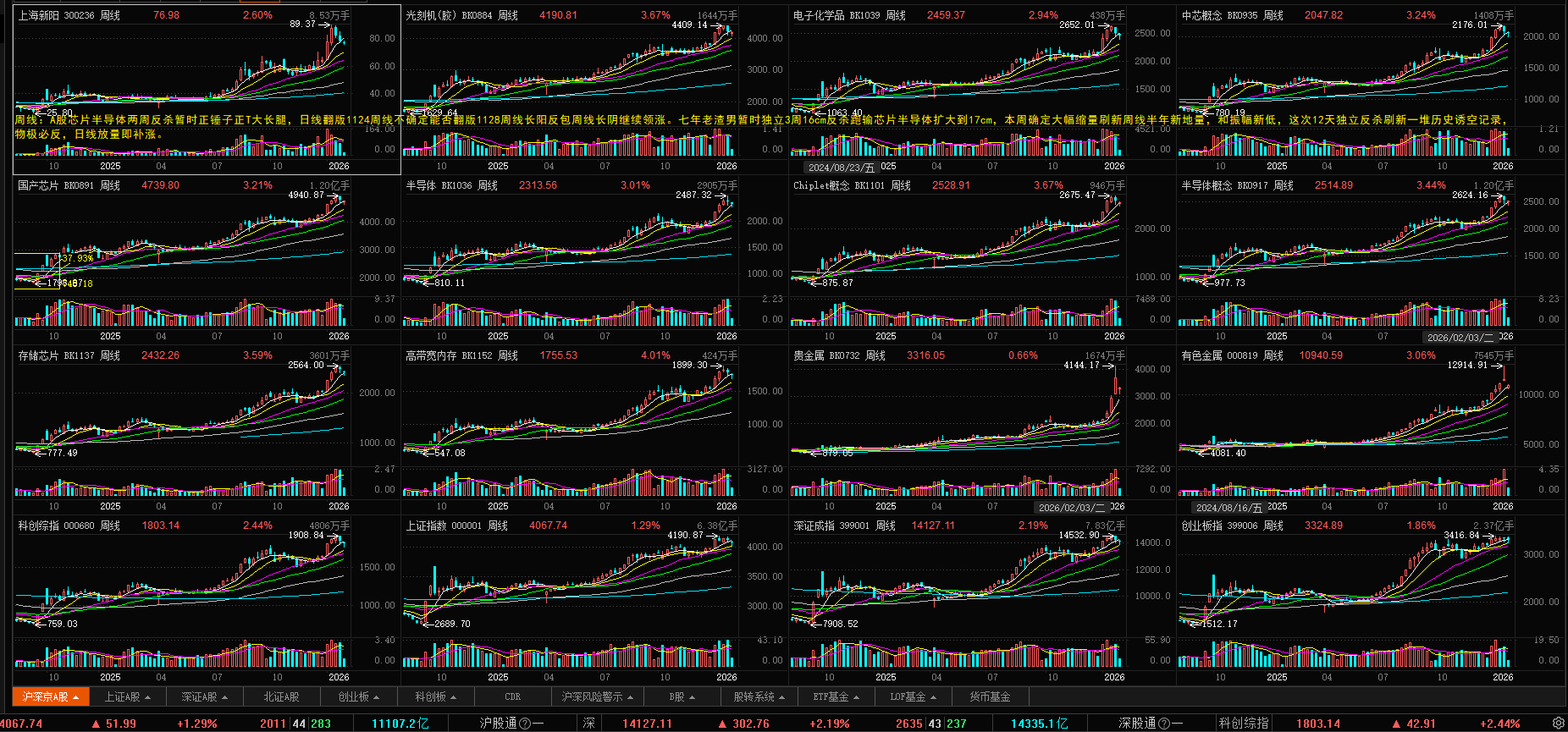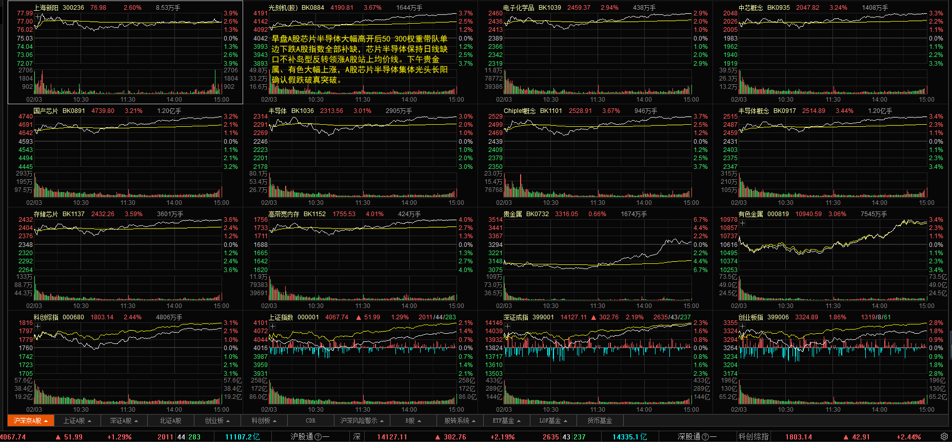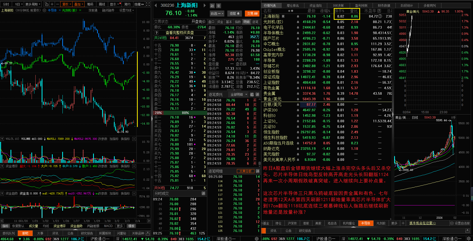 昨日A股盘后金银期货继续大幅上涨杀完空头多头后又杀空头。芯片半导体日线岛型反转高开高走光头长阳翻版1124再来一次小周期假跌破真突破。进入继续向上要补点量。