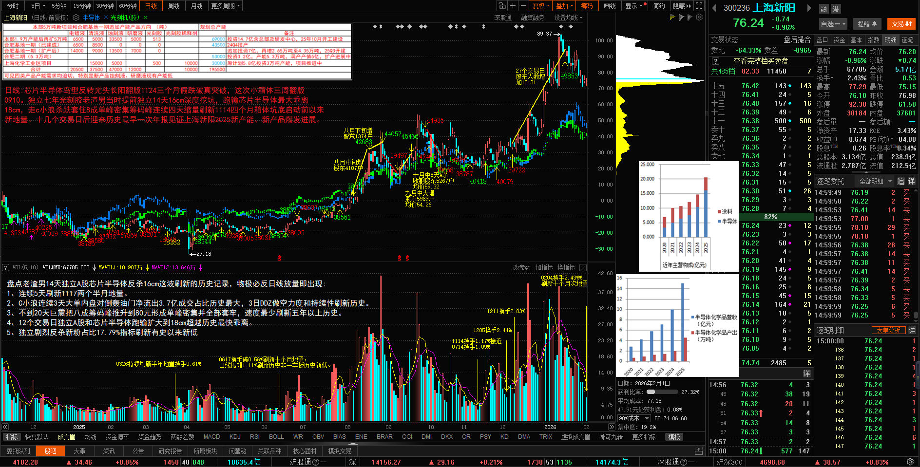 上海新阳14天独立深度反杀以来持续大幅缩量换手2.43%直接刷新1114以来三个多月新地量,创造一堆历史记录。4根坑底墓碑线仙人指路独立跑输A股芯片半导体十几个点,日线放量物极必反即出现!