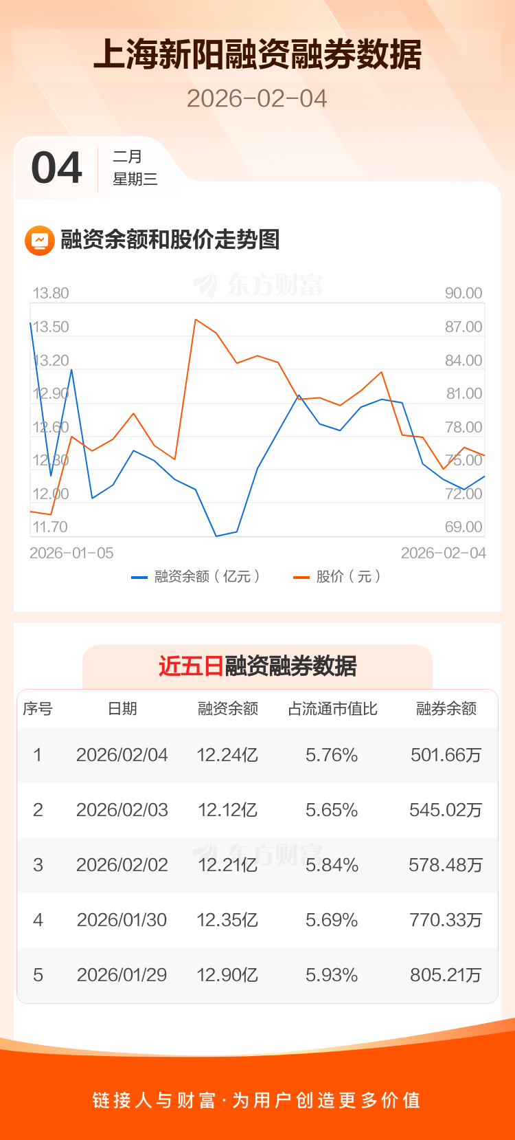 交易所最新数据显示,上海新阳于2026年2月4日获融资买入6032.52万元,融资偿还4802.48万元,当日融资净买入1230.04万元。目前,该股融资余额12.24亿,占流通市值比例为5.76%。