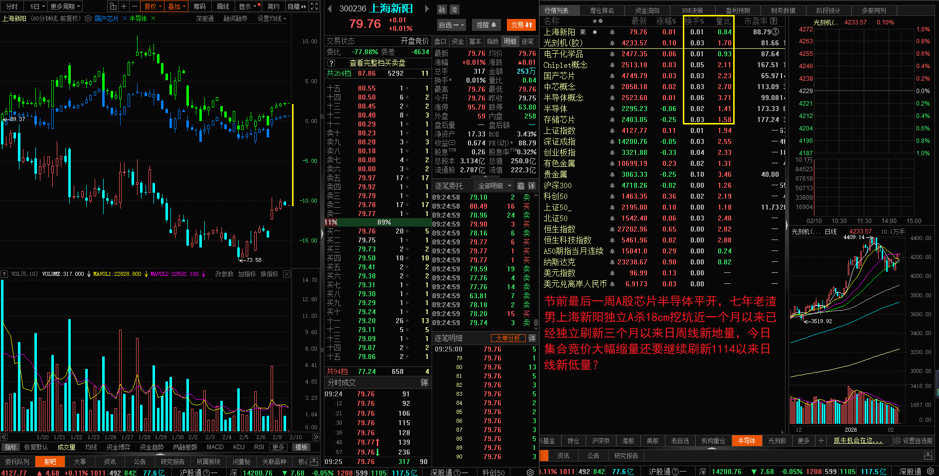 节前最后一周A股芯片半导体平开,七年老渣男上海新阳独立A杀18cm挖坑近一个月以来已经独立刷新三个月以来日周线新地量,今日大幅缩量还要继续刷新1114以来日线新低量?