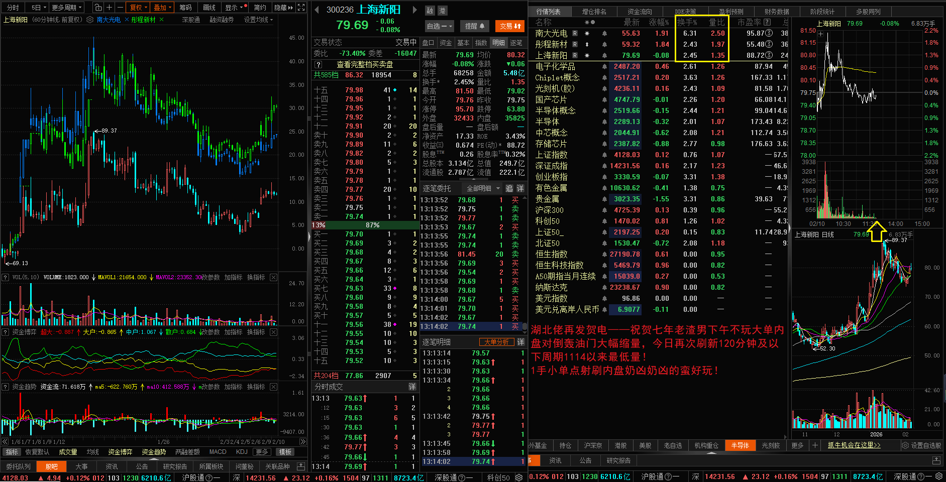 昨日第二小时刷新1114三个月新地量换手0.38%,目测第三小时换手0.28%又大幅刷新60分钟新地量,量化单挂单撤单表演。今日下午目测换手0.56%大幅刷新120分钟以下周期1114以来新地量。