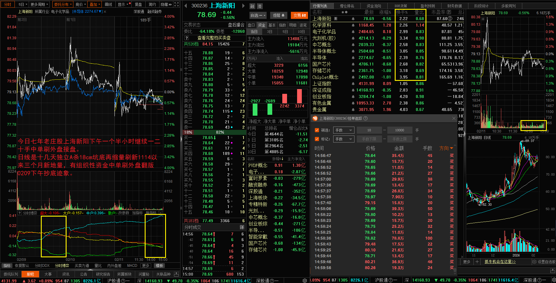 今日七年老庄股上海新阳下午一个半小时继续一二十手中单刷外盘接盘翻版0209下午。