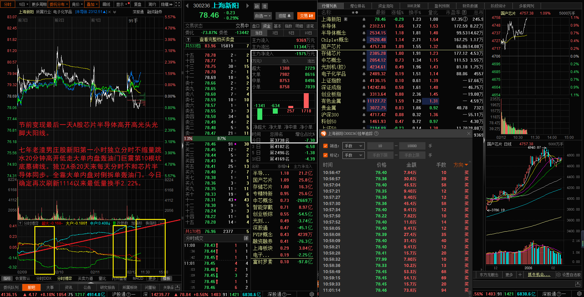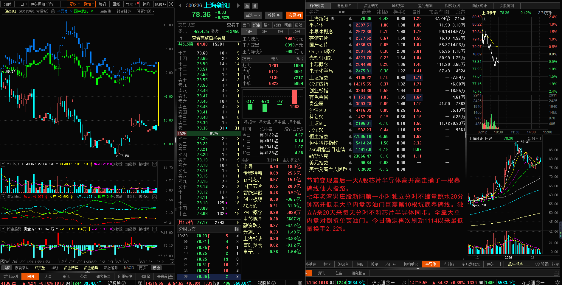 $节前变现最后一天A股芯片半导体高开高光头光脚大阳线。七年老渣男庄股新阳第一小时