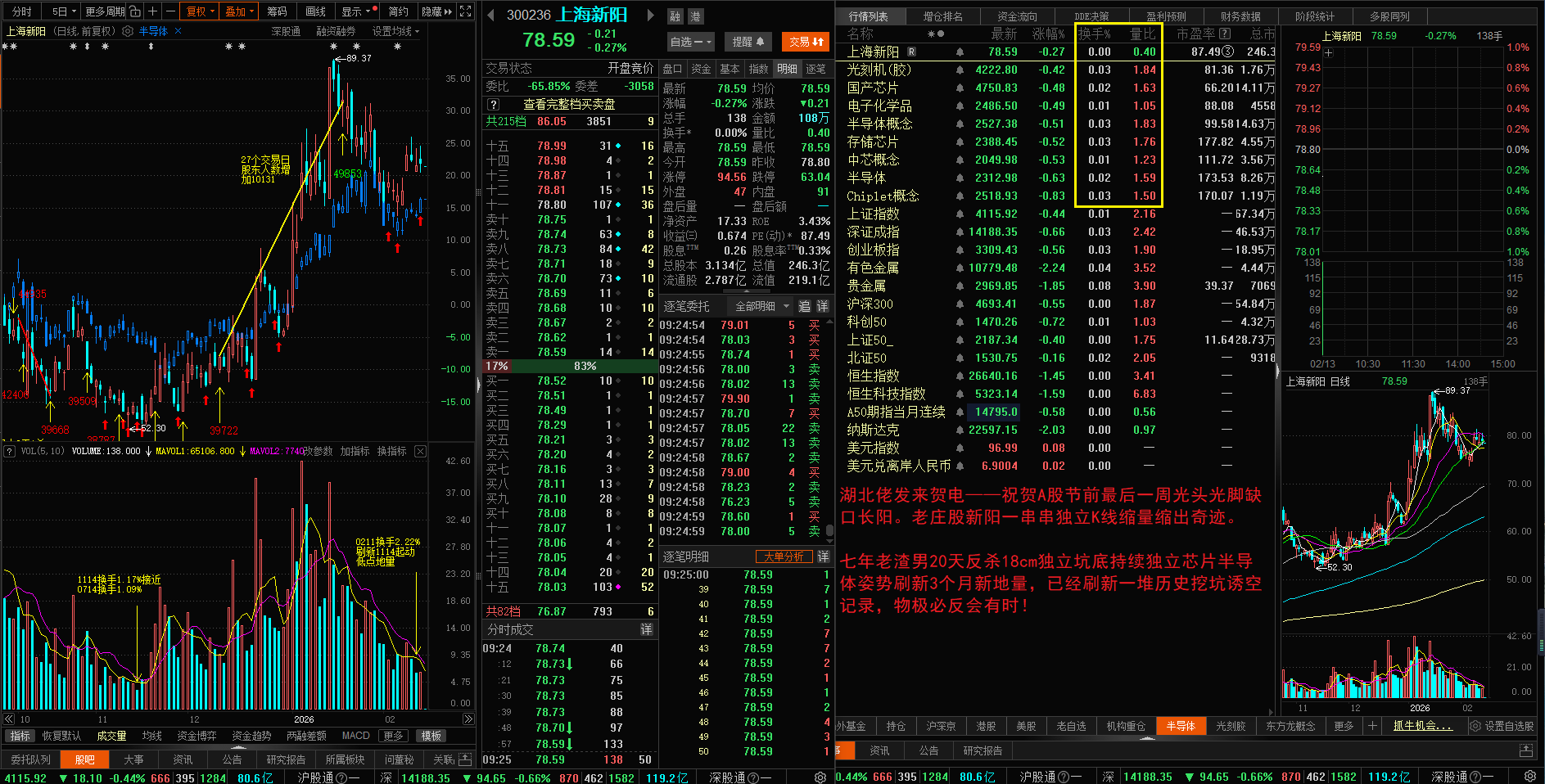 湖北佬发来贺电——祝贺A股节前最后一周光头光脚缺口长阳。老庄股新阳一串串独立K线缩量缩出奇迹。