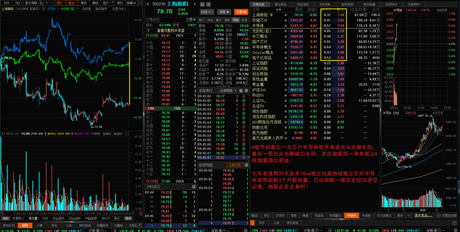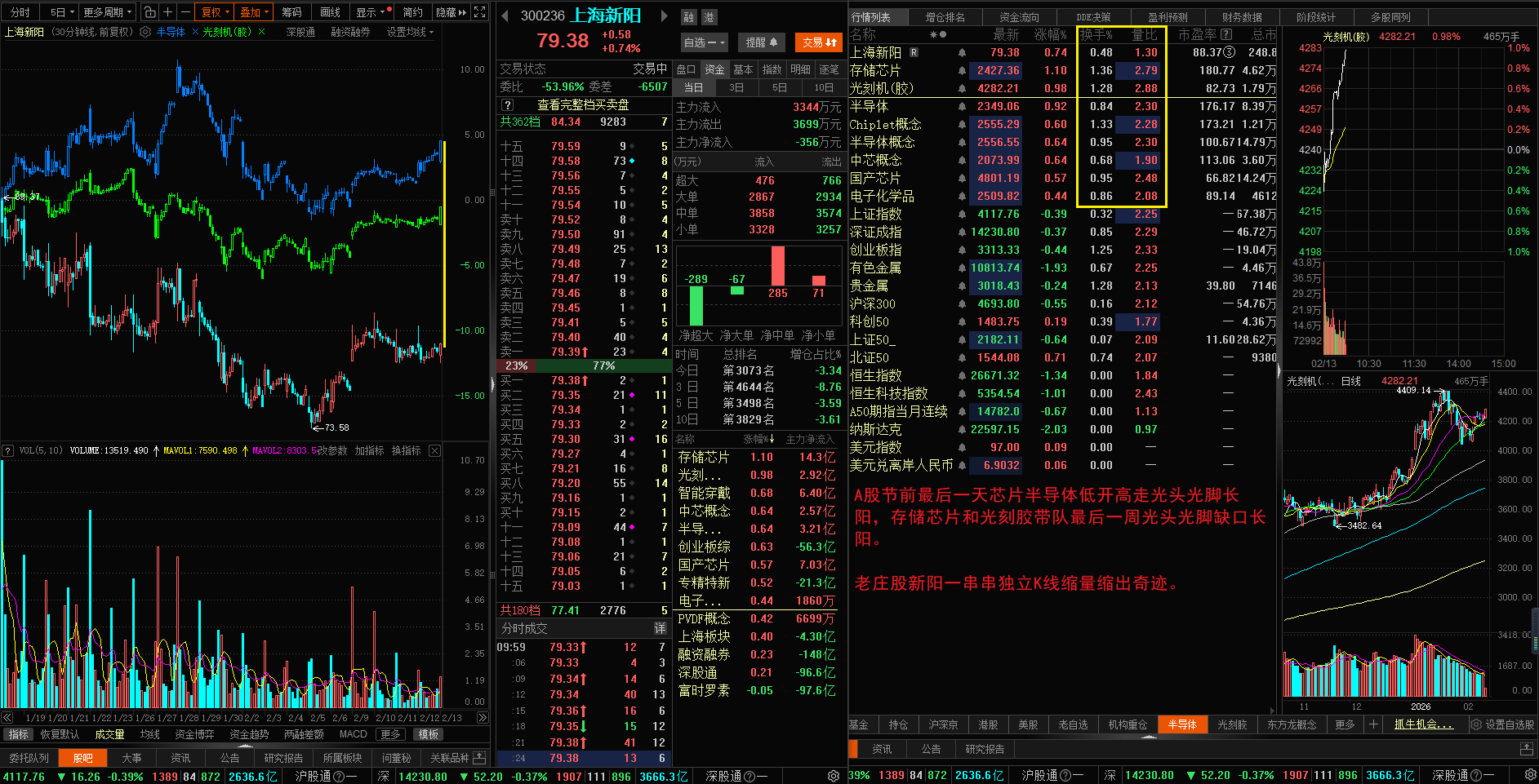 A股节前最后一天芯片半导体低开高走光头光脚长阳,存储芯片和光刻胶带队最后一周光头光脚缺口长阳。老庄股新阳一串串独立K线缩量缩出奇迹。