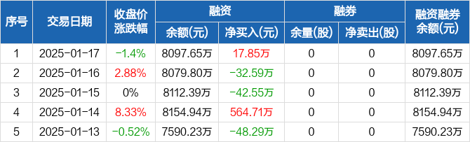 美晨科技:融资净买入17.85万元,融资余额8097.65万元(01-17)