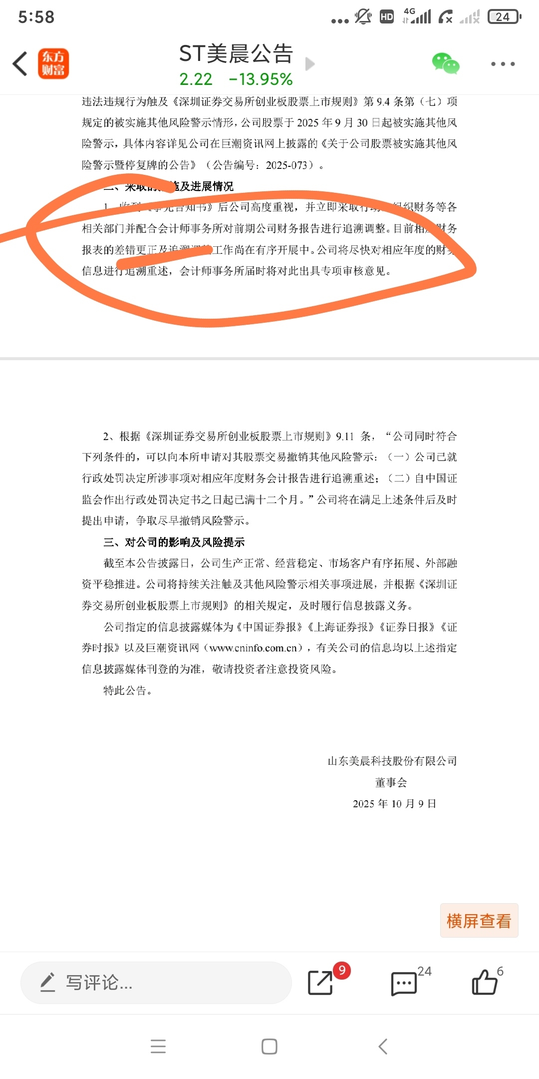 $ST美晨(SZ300237)$ 散户就是散户,没学过会计真可怕!因会计差错导致财务报表偏差(不真实)而st,会计差错是计价方式或者会计政策不标准导致报表偏差!公司目前正在纠正会计差错调整整改财务报表计算方式,散户就喊叫退市,比起那些明目张胆的财务造假,虚报资产强多了!今天只要大福低开满仓介入!后市必有回报!