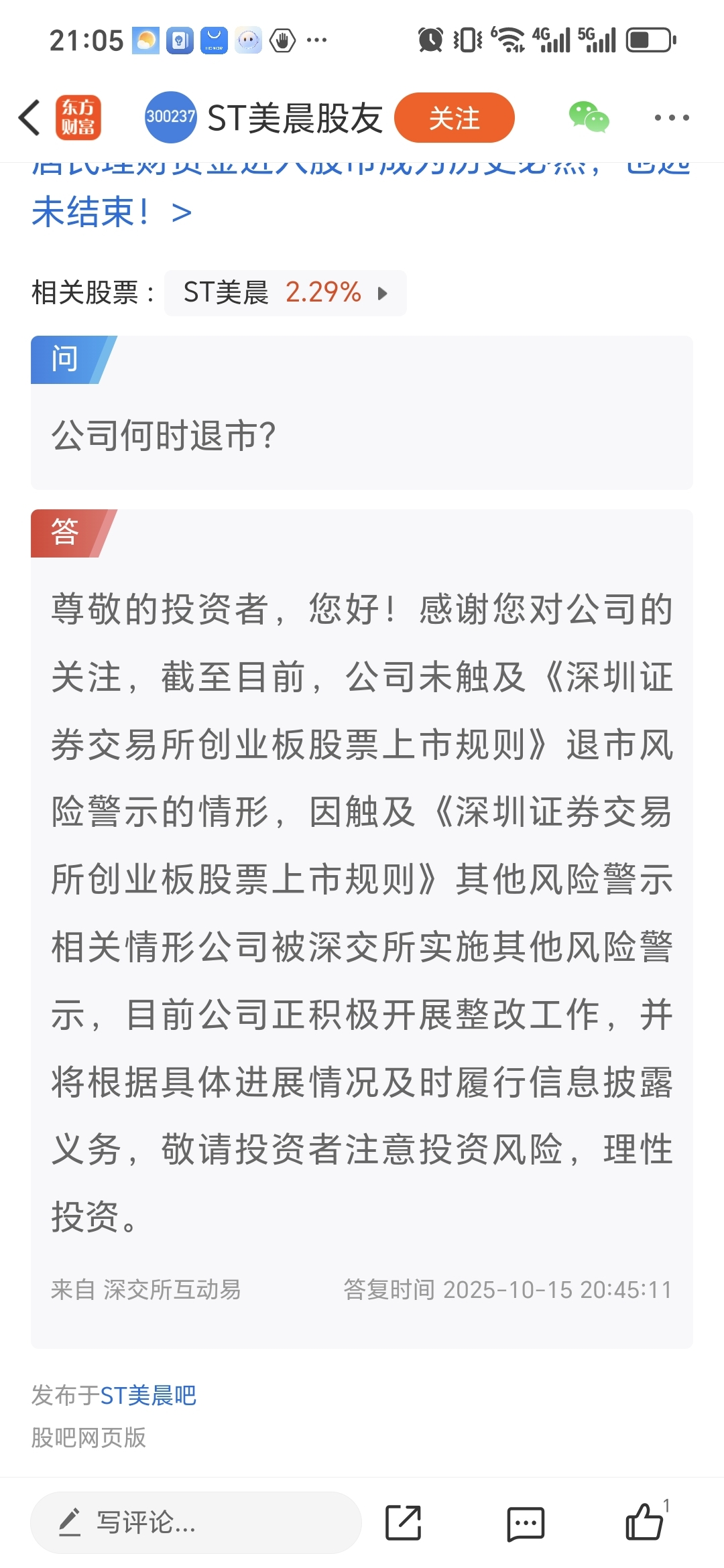 $ST美晨(SZ300237)$ 还有人问退市,真是文盲不会看处罚落地了,就st而已,还要重组,重组成功,翻10倍,为什么那多外资进来
