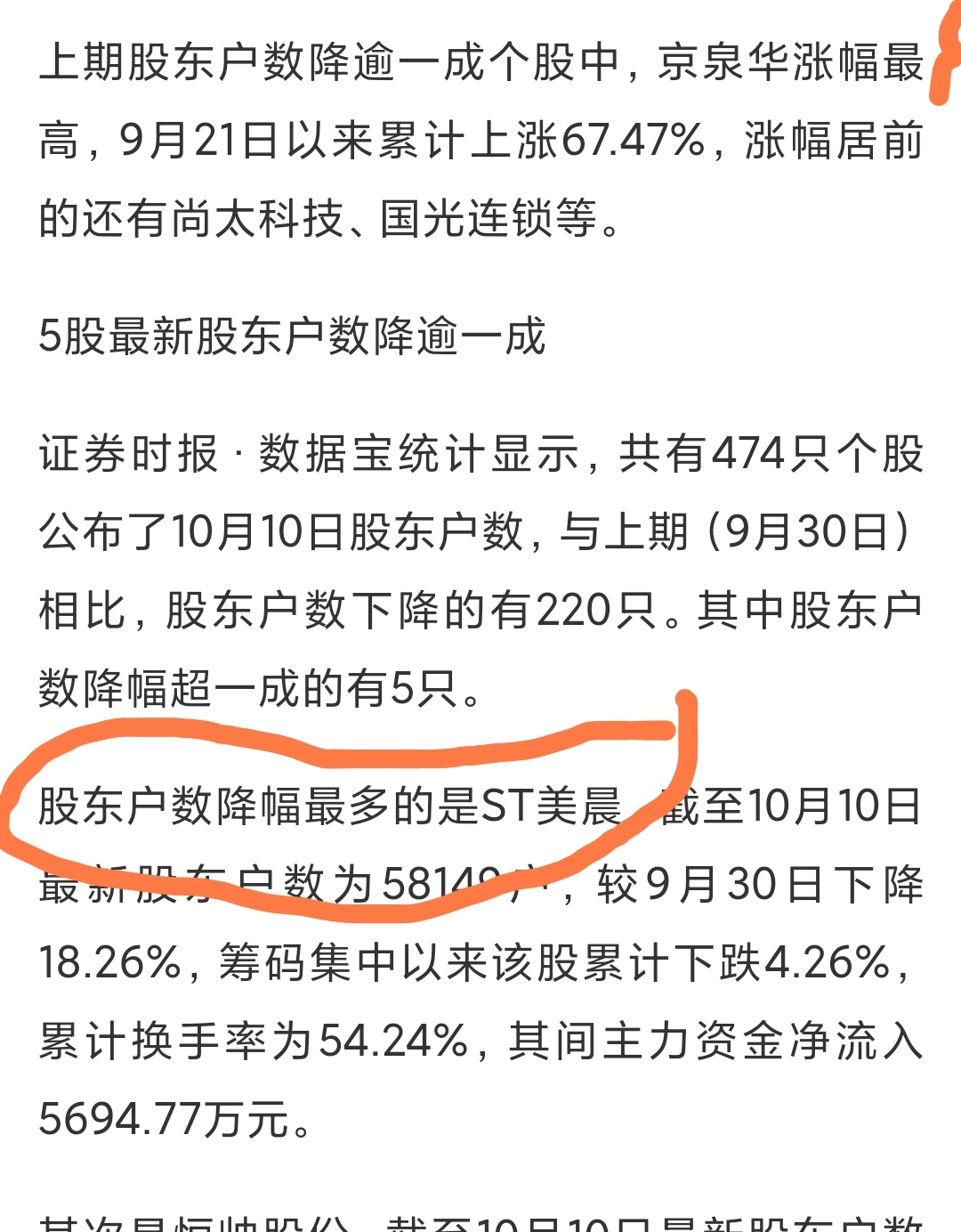 $ST美晨(SZ300237)$ 股东户数降二成,高度集中控盘。是好是坏股民都懂。