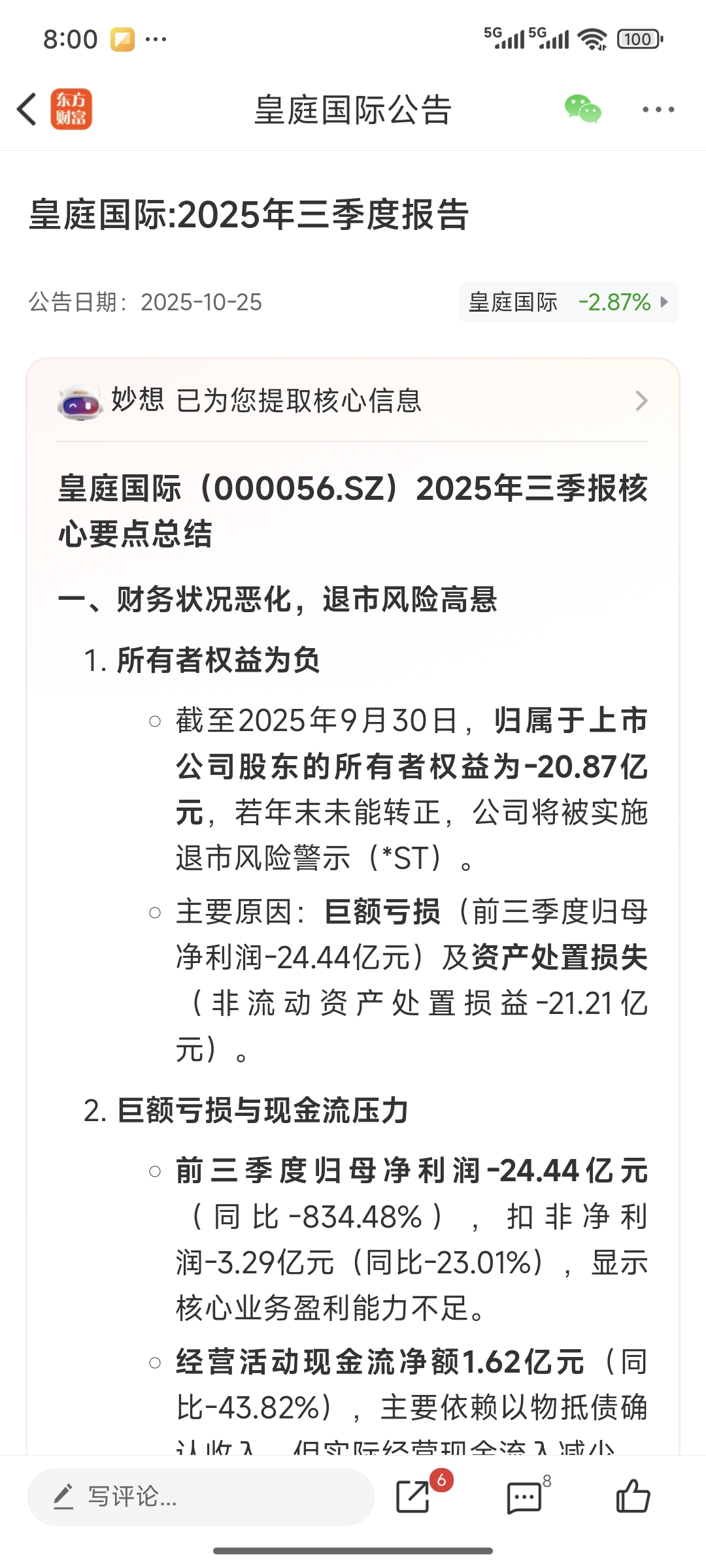 好心提醒大家一下,这股不要堵三季报,看看皇庭五万股民太惨了