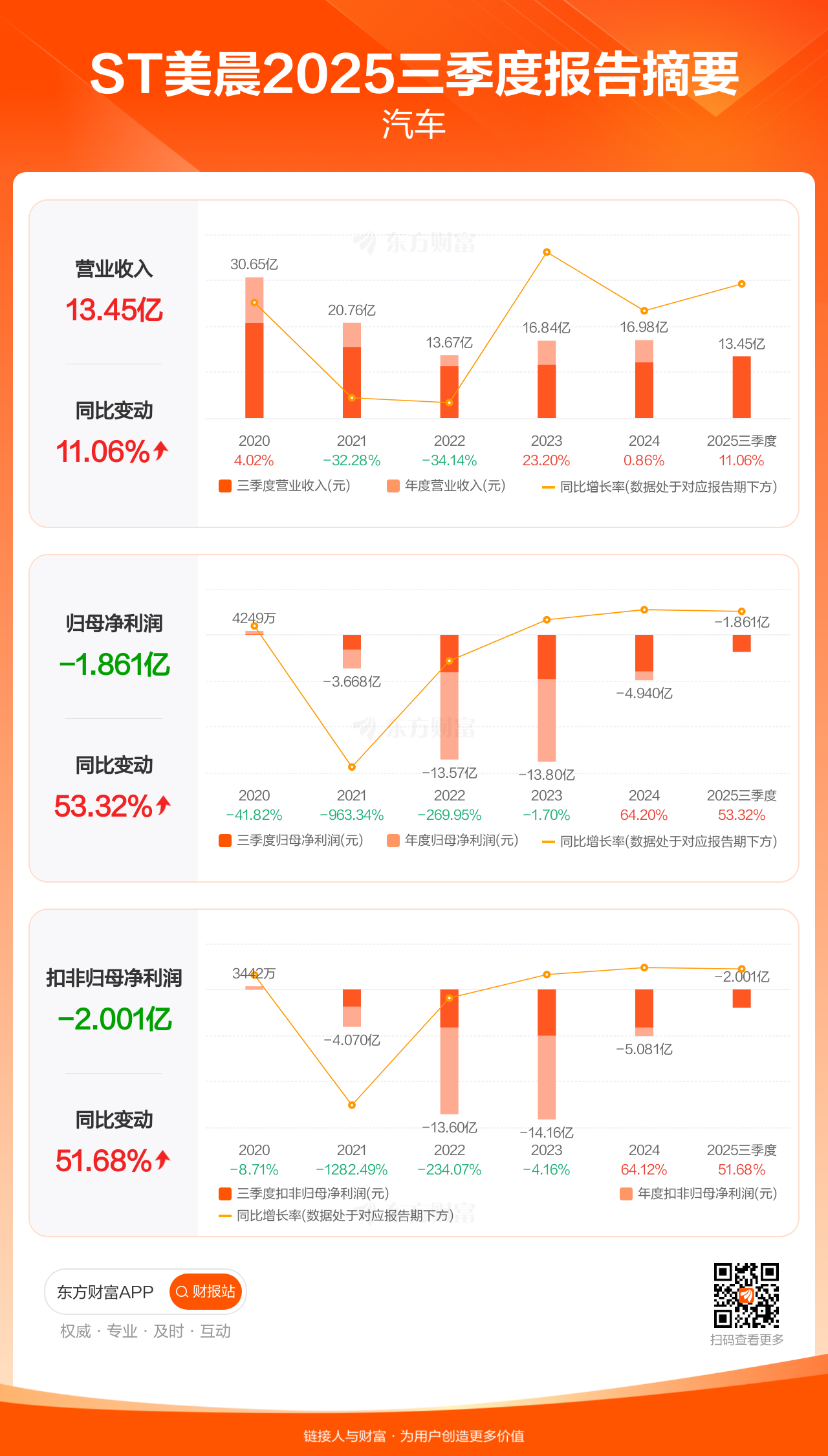 ST美晨10月31日发布2025年三季报显示,公司前三季实现营业收入13.45亿元,同比增长11.06%;归母净利润-1.86亿元;扣非归母净利润-2.00亿元。