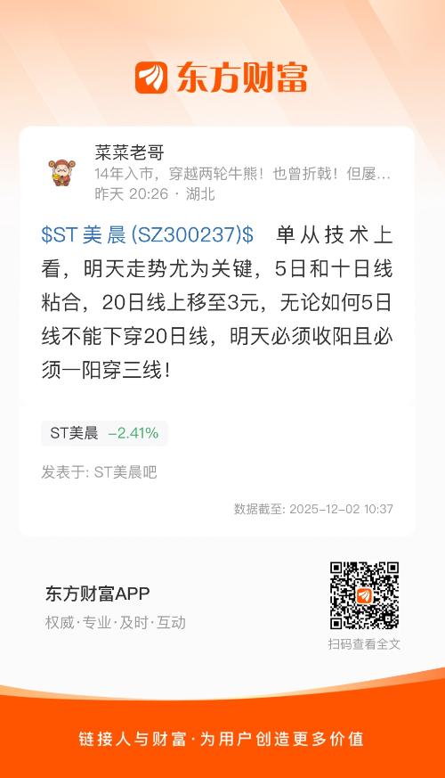 $ST美晨(SZ300237)$ 单从技术上看,明天走势尤为关键,5日和十日线粘合,20日线上移至3元,无论如何5日线不能下穿20日线,明天必须收阳且必须一阳穿三线!