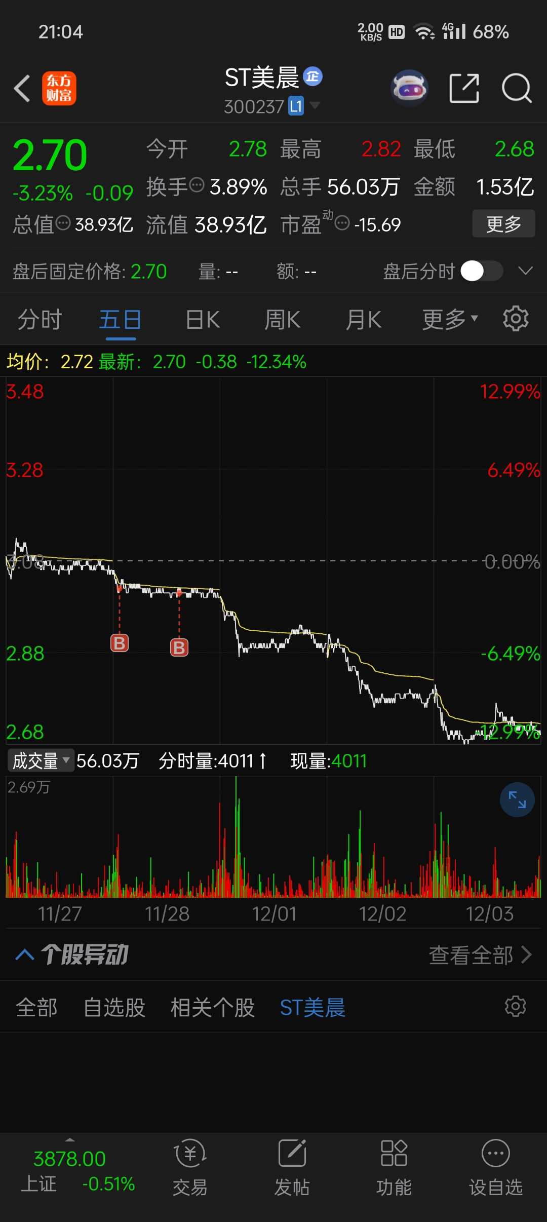 $ST美晨(SZ300237)$ 拿了半个月,一路加仓。亏12个点。明天斩仓。以后再不碰短线。为自己行为负责。好好选一个长线,亏12个点,能赚回来。