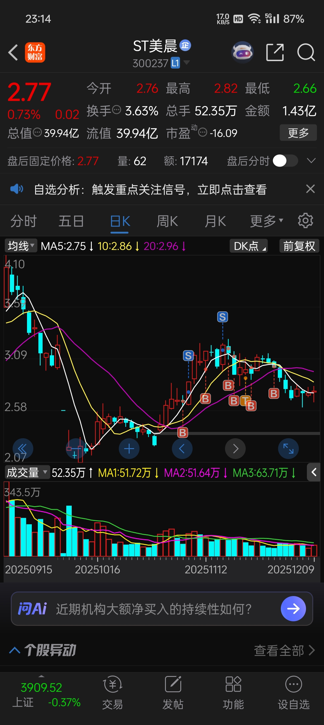 $ST美晨(SZ300237)$ 睡不着了,本来也不舒服。额。建仓21天,可算熬过了早晨前的黑暗。原来长线那么磨人,是玩习惯了超短,前几天都差点斩仓了。且行且看吧。还得多学习才行。没敢满仓干,以后不会轻易梭哈了。