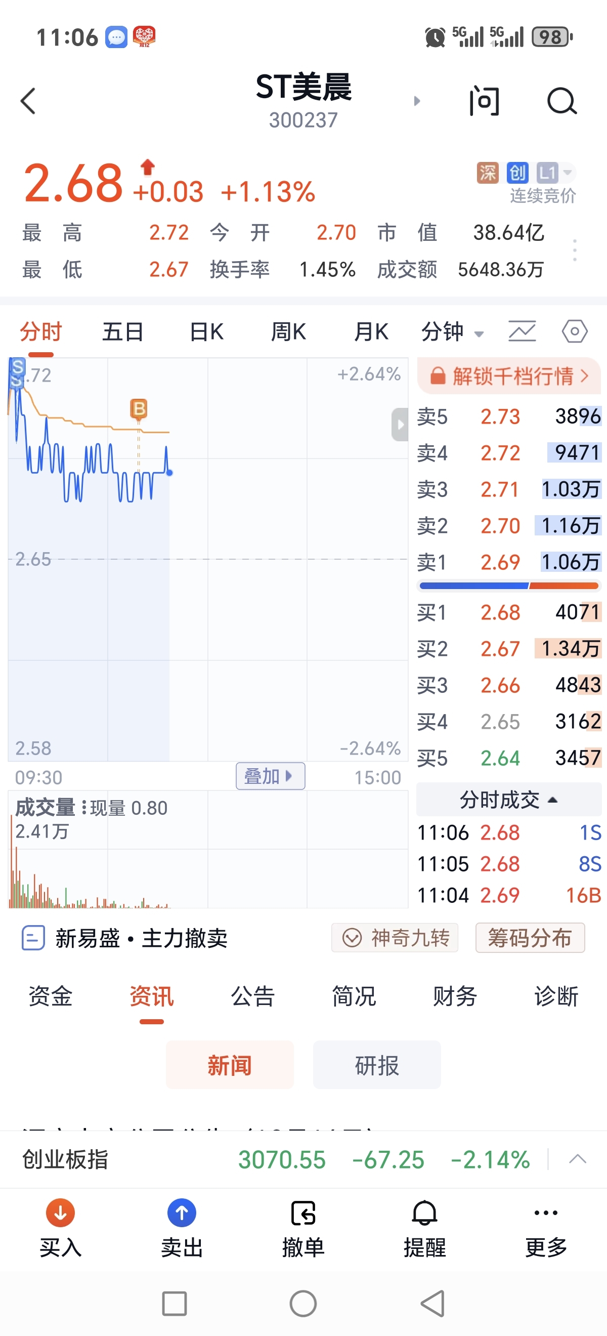 $ST美晨(SZ300237)$ T了4分钱,也是爱。