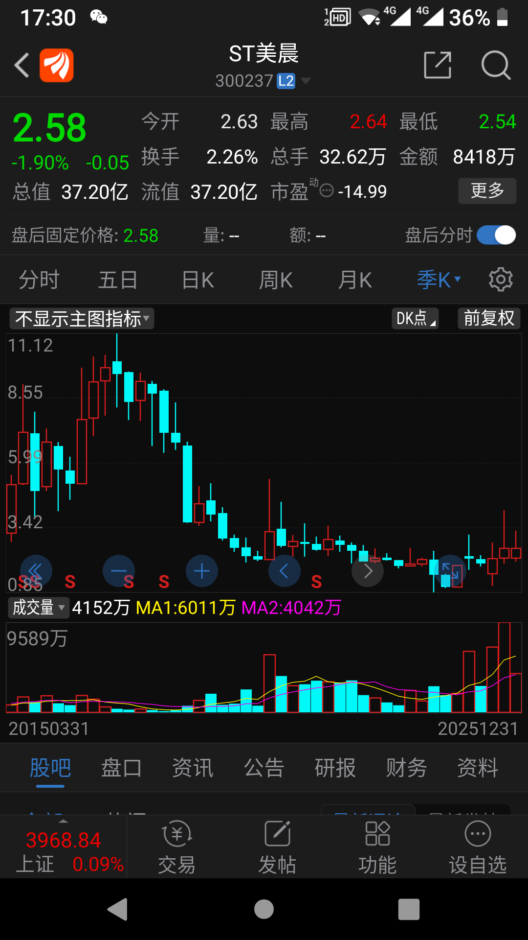 三季度和四季度的k线实体,开盘价都是2.19,收盘价都是2.58,两个季度的k线