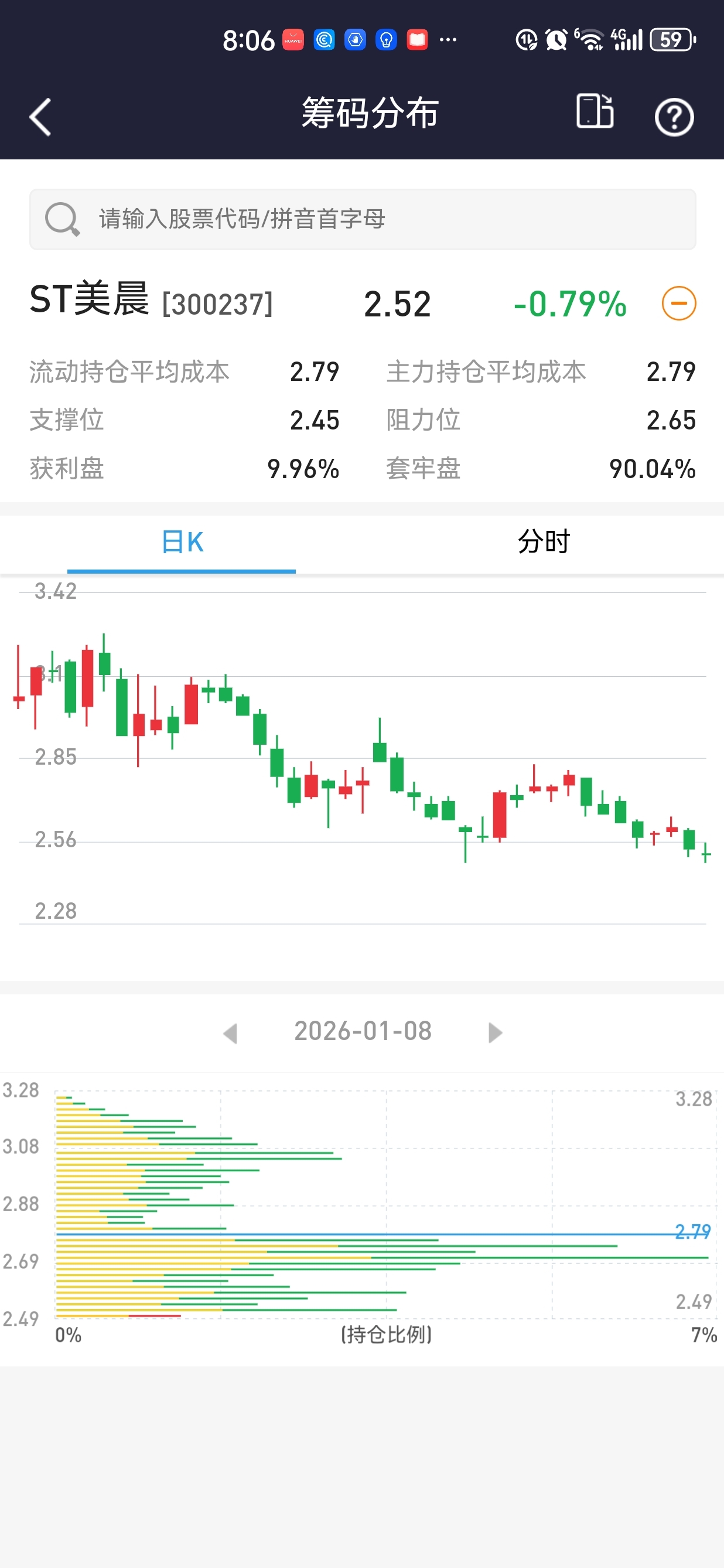 我查了下美晨科技今天的筹码分布图,发现没有了获利盘全是套牢盘,最高套牢在3.28