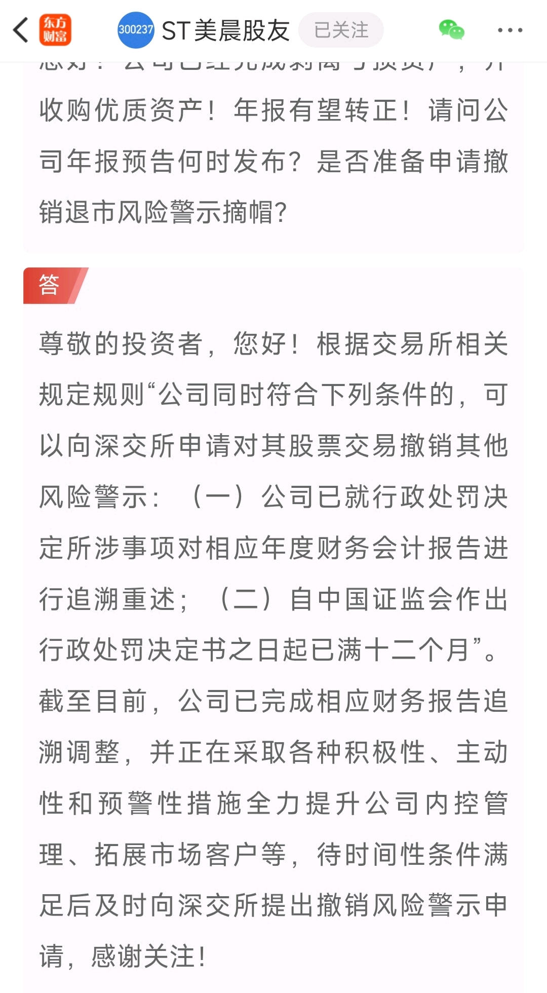 $ST美晨(SZ300237)$ 摘帽时间已确定26年10月31日以后,别再叽叽喳喳的了,因已跨过第三季度,预计26年年报后,最快27年4月30日,风险已提示,大家决定留与不留