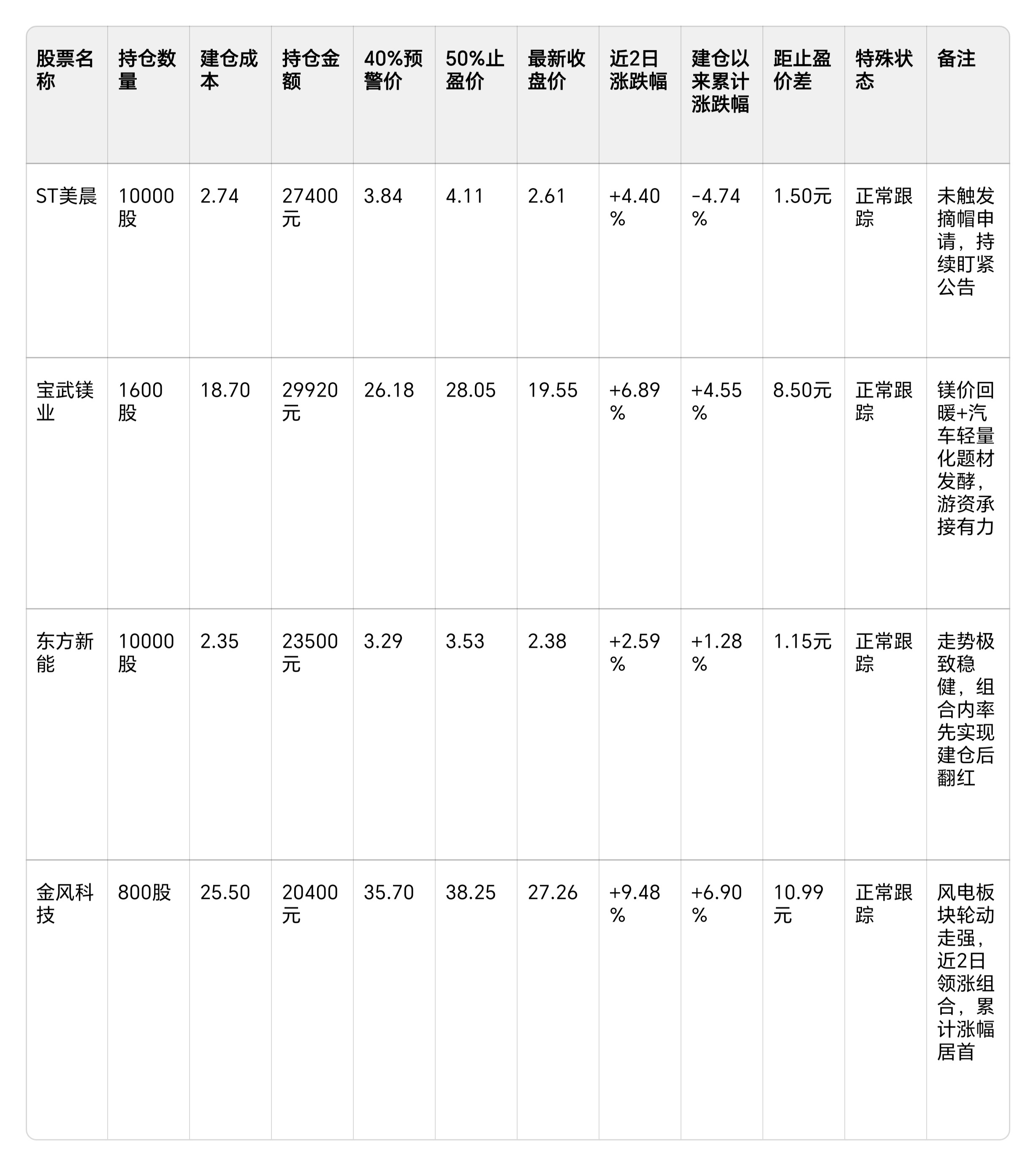 根据$ST美晨(SZ300237)$ $宝武镁业(SZ002182)$ 东方新能 及 $金风科技(SZ002202)$ 四只股票在2月13日(节前)和2月25日(节后第二个交易日)的收盘价数据,结合市场表现,对"驷马奔腾"实盘大赛开赛两天的表现进行如下点评: