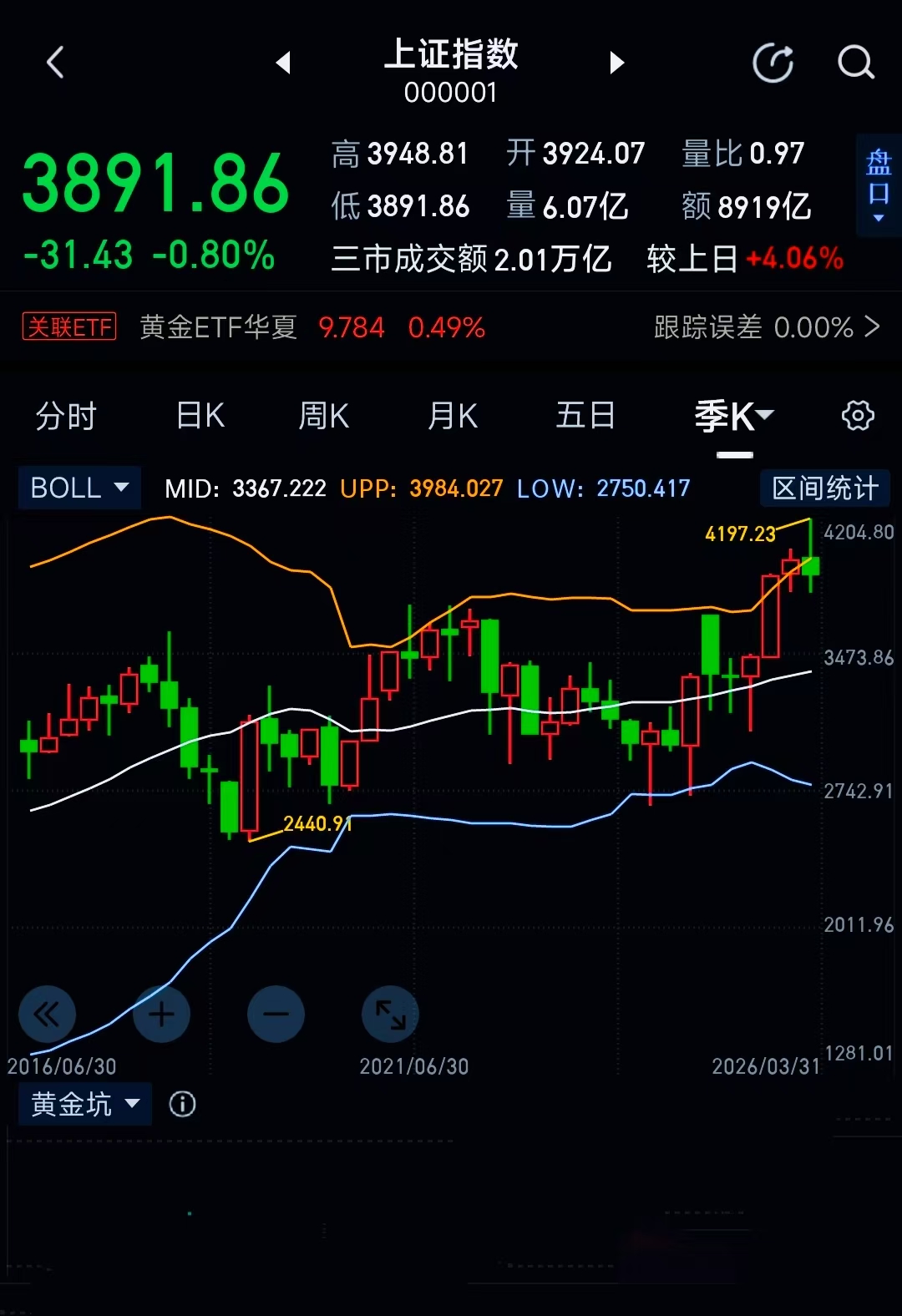 上证指数 季K线图 布林线 触出上轨