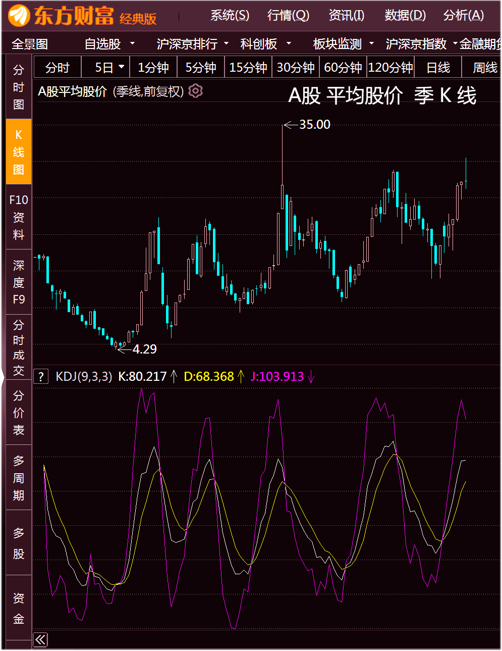 A股平均股价,季K线图 KDJ 第五次高位调头