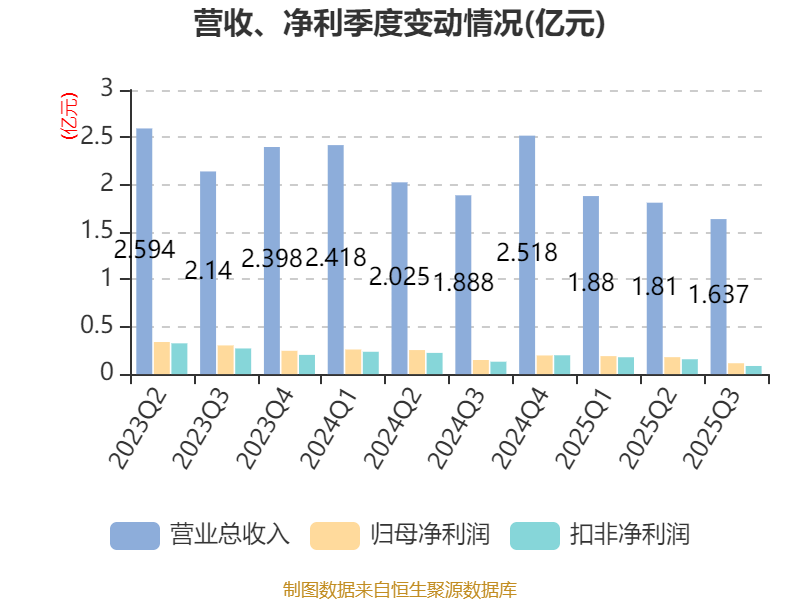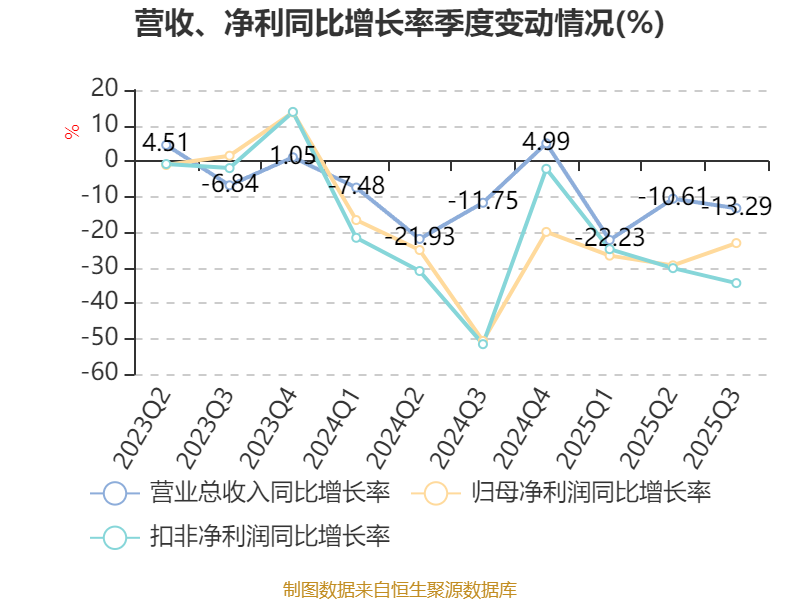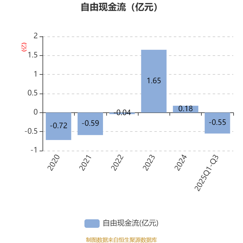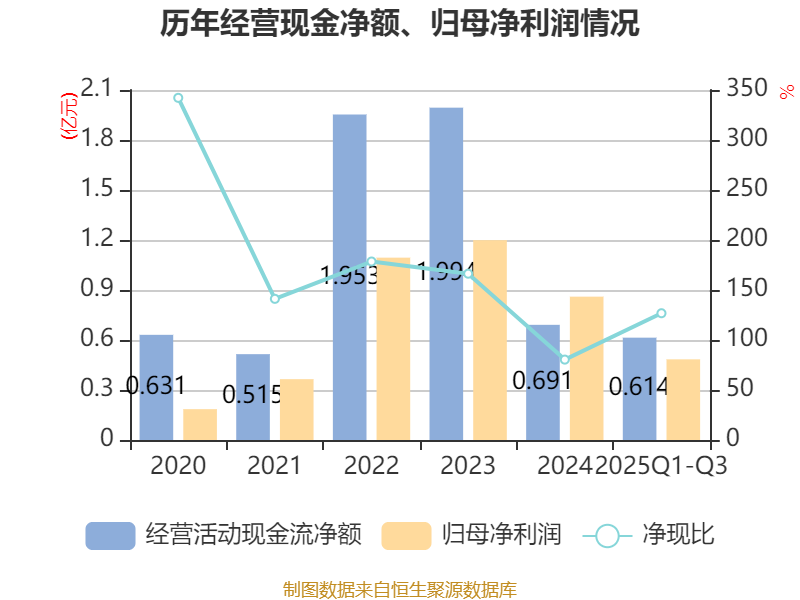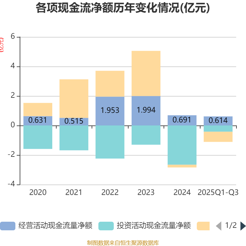 2025年前三季度,公司经营活动现金流净额为6141.77万元,同比增长109.82%;筹资活动现金流净额-6889.16万元,同比减少4993.22万元;投资活动现金流净额-4237.75万元,上年同期为-1.35亿元。