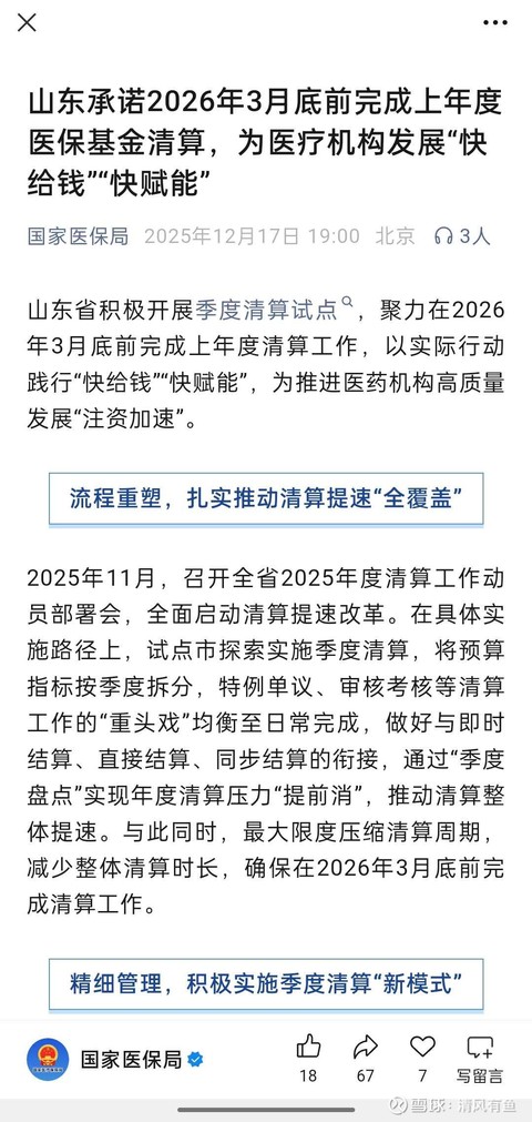 山东承诺2026年3月底前完成上年度医保基金清算,为医疗机构发展“快给钱”“快赋能”