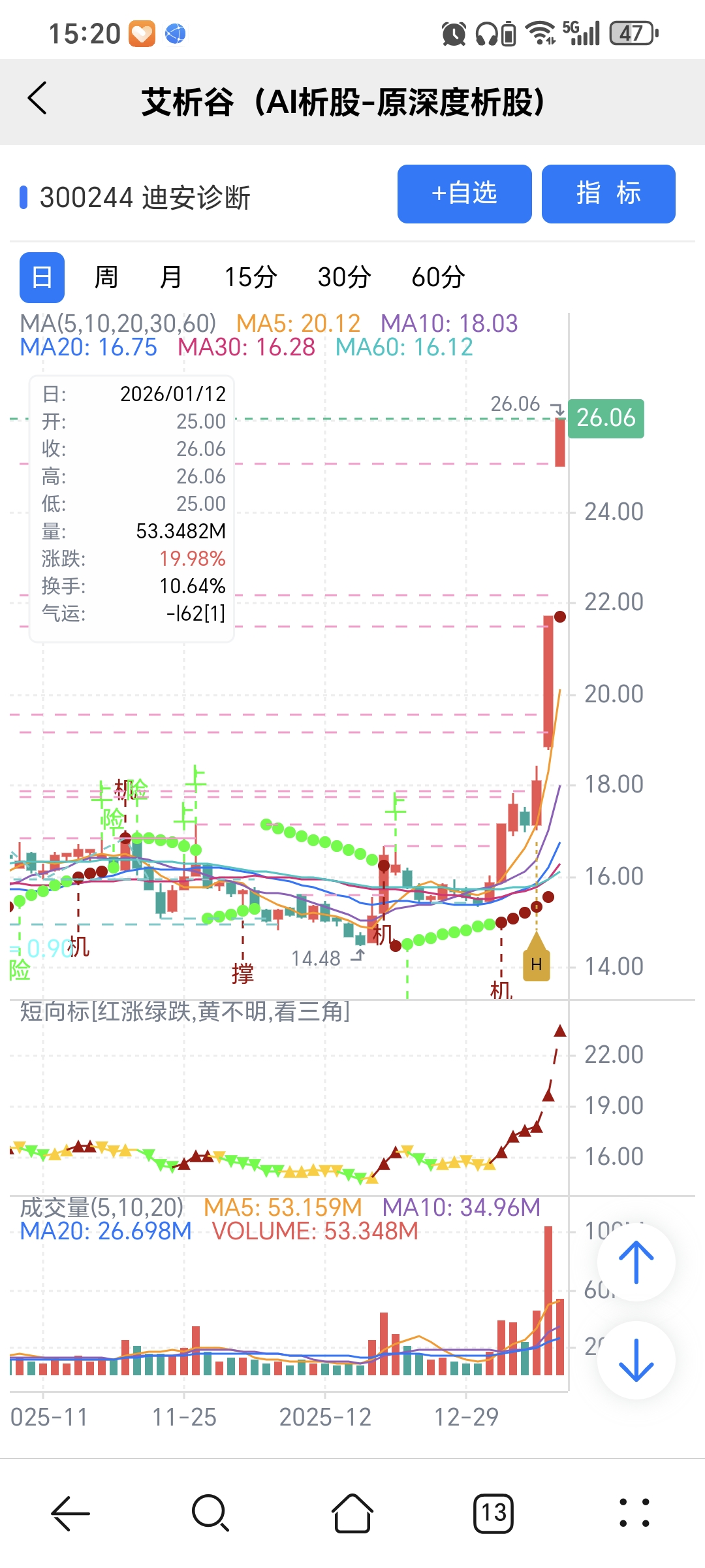 风险:股价下穿艾短波或红变绿、绿字。