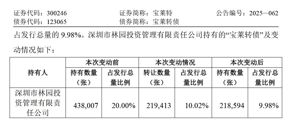 下修无望!!林园大幅减持宝莱转债