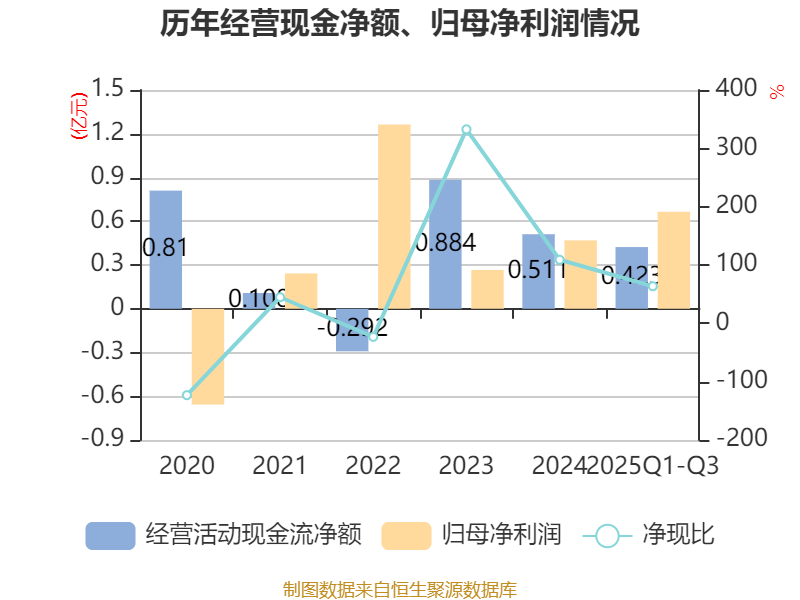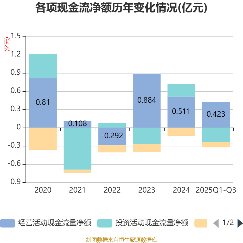 2025年前三季度,公司经营活动现金流净额为4226.47万元,同比增长172.92%;筹资活动现金流净额-860.92万元,同比增加121.73万元;投资活动现金流净额-2401.08万元,上年同期为8504.41万元。