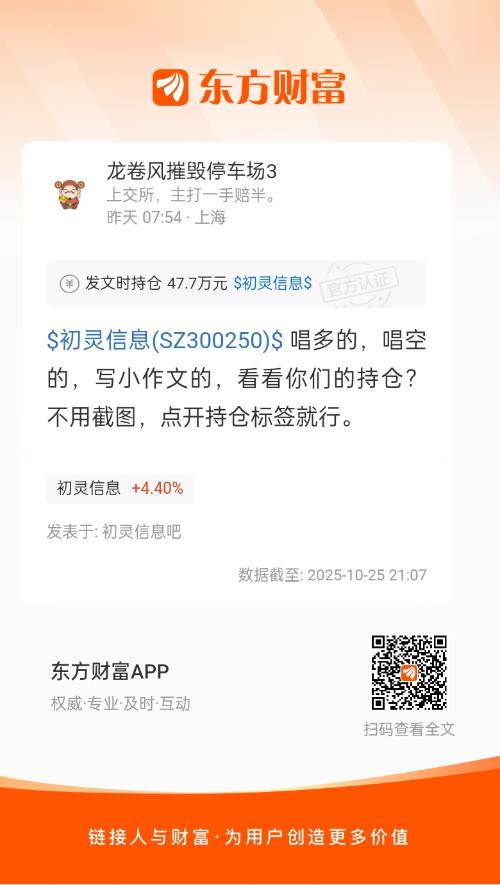 $初灵信息(SZ300250)$ 唱多的,唱空的,写小作文的,看看你们的持仓?不用截图,点开持仓标签就行。