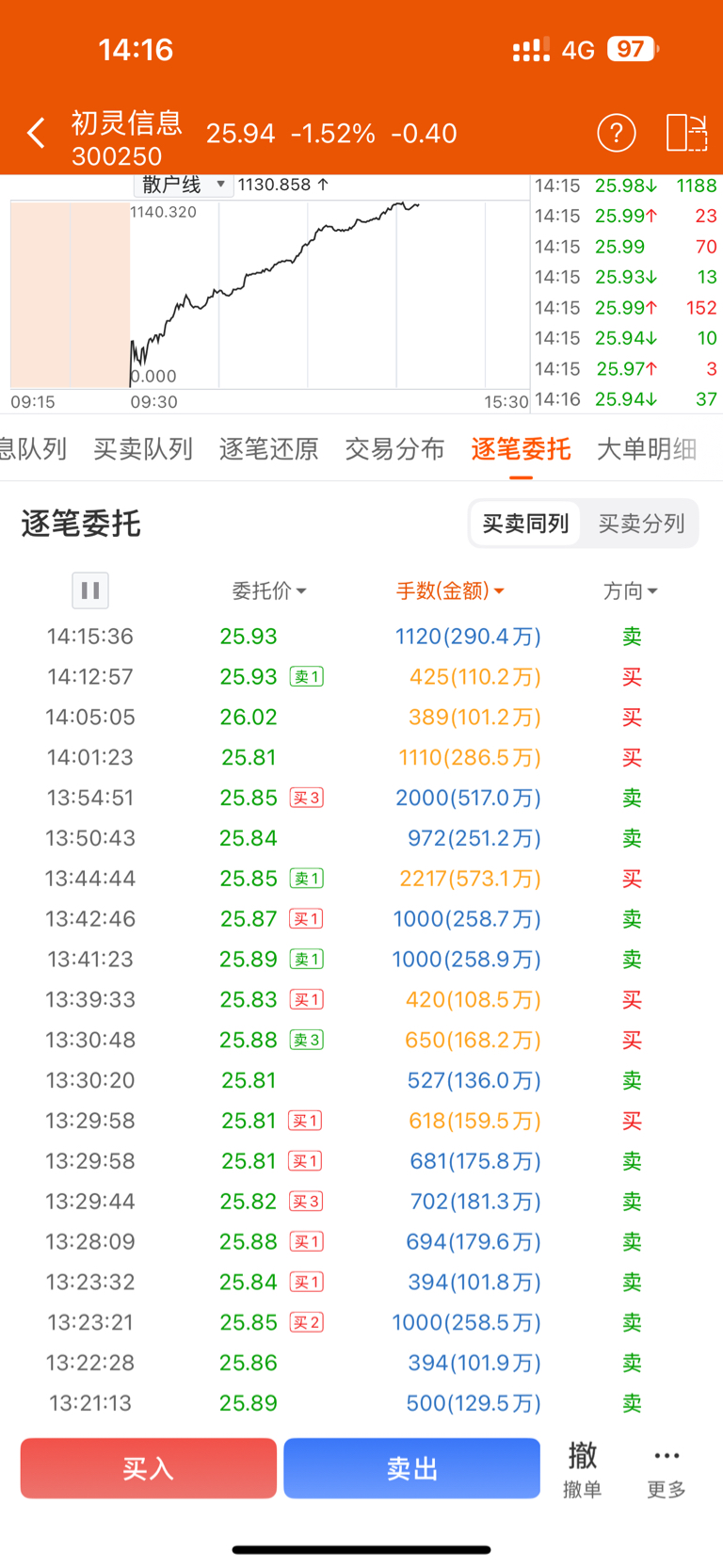 $初灵信息(SZ300250)$ 好家伙,一直盯着,全是挂的低价砸出去啊